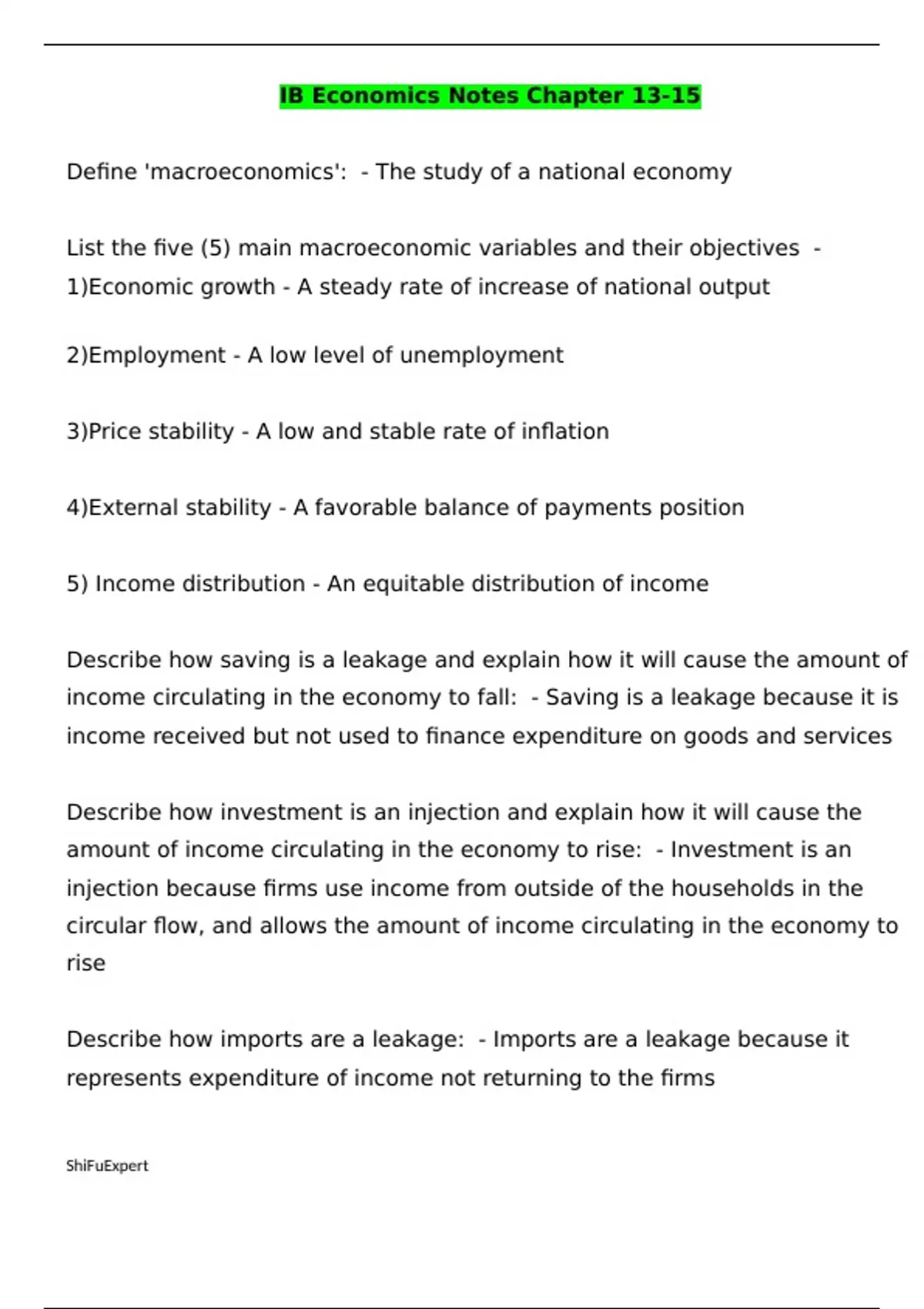 IB Economics Notes Chapter 13-15 Define 'macroeconomics': - The study of a national economy List the five (5) main macroeconomic variables and their objectives - 1)Economic growth - A steady rate of increase of national output 2)Employment - A low level of unemployment 3)Price stability - A low and stable rate of inflation 4)External stability - A favorable balance of payments position 5) Income distribution - An equitable distribution of income Describe how saving is a leakage and explain how it will cause the amount of income circulating in the economy to fall: - Saving is a leakage because it is income received but not used to finance expenditure on goods and services Describe how investment is an injection and explain how it will cause the amount of income circulating in the economy to rise: - Investment is an injection because firms use income from outside of the households in the circular flow, and allows the amount of income circulating in the economy to rise Describe how imports are a leakage: - Imports are a leakage because it represents expenditure of income not returning to the firms Describe how exports are an injection: - Exports represent a source of income not coming directly from the household Describe how taxes are a leakage: - Taxes take money out from the circular flow of the economy Describe how government spending is an injection: - Government spending puts money back into the circular flow Define 'transfer payments' and provide examples; injection? - Payments to individuals that are not the result of an increase in output; not an injection; pensions, unemployment benefits, child allowance payments Describe when the economy is in equilibrium: - When leakages are equal to injections Describe the three (3) different methods used to calculate Gross Domestic Product (GDP): - 1) output: Measuring the actual value of all the goods and services produced, summing up all of the value added by all the firms in an economy