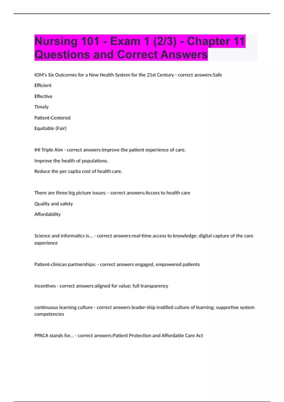 Nursing 101 - Exam 1 (2,3) - Chapter 11 Questions and Correct Answers.