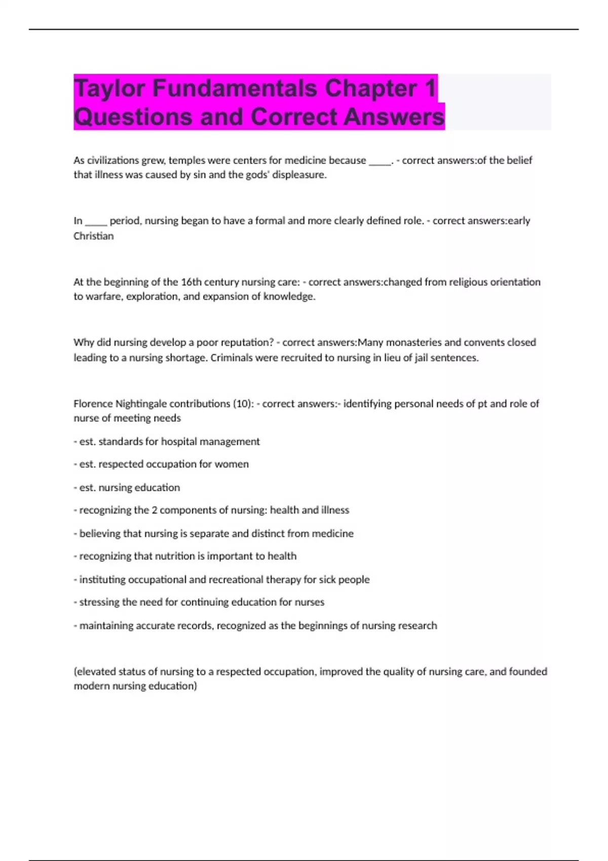 Florence Nightingale contributions (10): - correct answers:- identifying personal needs of pt and role of