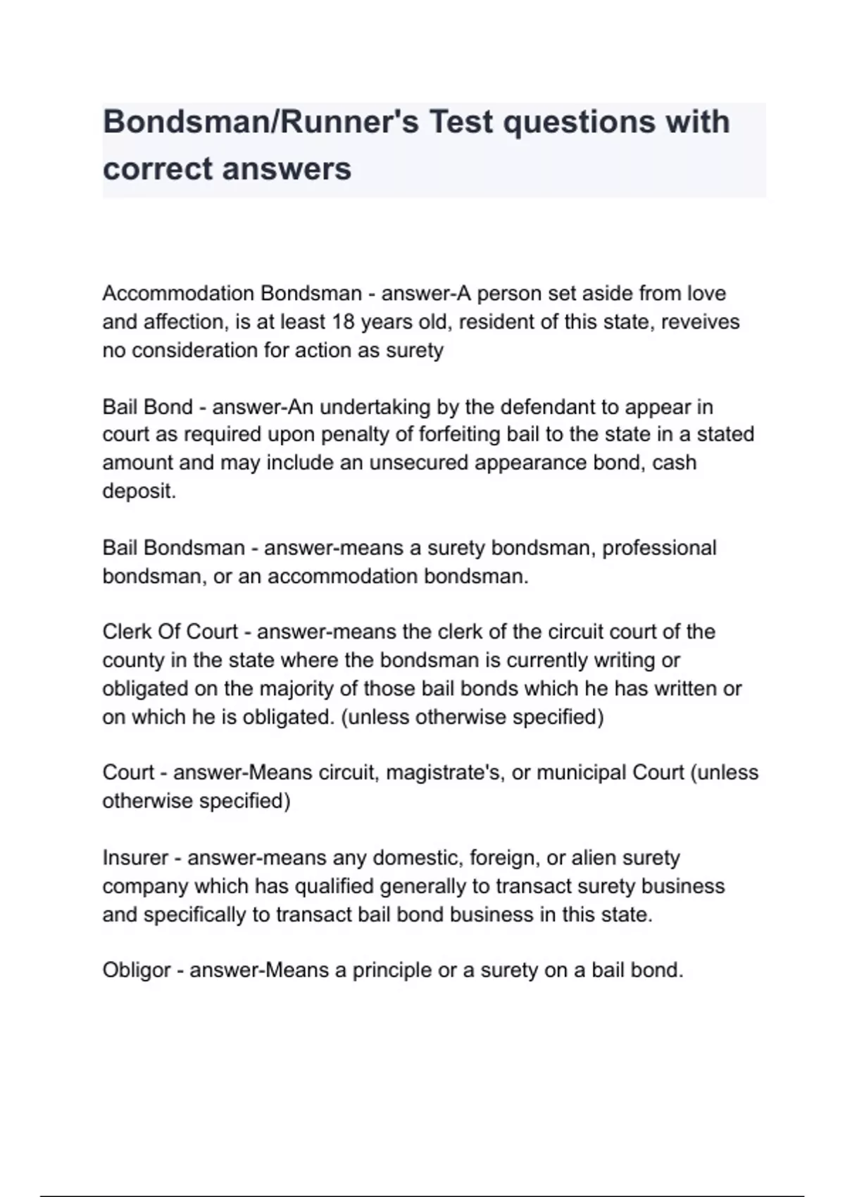 Bondsman/Runner's Test questions with correct answers