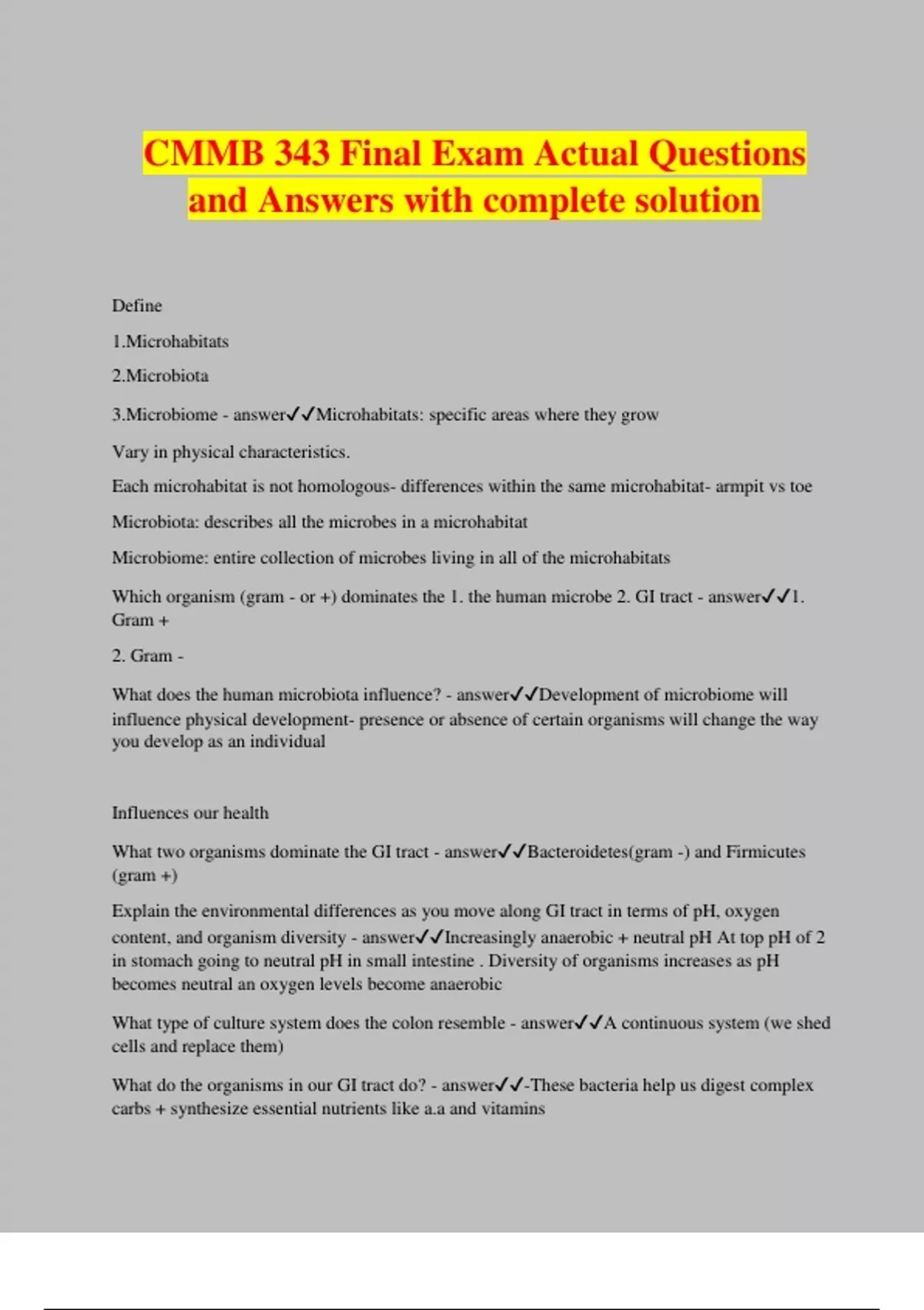 CMMB 343 Final Exam Actual Questions and Answers with complete solution Define 1.Microhabitats 2.Microbiota 3.Microbiome - answerMicrohabitats: specific areas where they grow Vary in physical characteristics. Each microhabitat is not homologous- differences within the same microhabitat- armpit vs toe Microbiota: describes all the microbes in a microhabitat Microbiome: entire collection of microbes living in all of the microhabitats Which organism (gram - or +) dominates the 1. the human microbe 2. GI tract - answer1. Gram + 2. Gram - What does the human microbiota influence? - answerDevelopment of microbiome will influence physical development- presence or absence of certain organisms will change the way you develop as an individual Influences our health What two organisms dominate the GI tract - answerBacteroidetes(gram -) and Firmicutes (gram +) Explain the environmental differences as you move along GI tract in terms of pH, oxygen content, and organism diversity - answerIncreasingly anaerobic + neutral pH At top pH of 2 in stomach going to neutral pH in small intestine . Diversity of organisms increases as pH becomes neutral an oxygen levels become anaerobic What type of culture system does the colon resemble - answerA continuous system (we shed cells and replace them) What do the organisms in our GI tract do? - answer-These bacteria help us digest complex carbs + synthesize essential nutrients like a.a and vitamins -Chemical modification of bile so it can be reabsorbed -Protects us from pathogens (microbial warfare) -Immune system development- trains our immune system to recognize normal from potentially pathogenic bacteria How do microorganisms affect fetal development? - answerFetus is sterile→ after birth, colonization begins with feeding and contact Babies born naturally vs c section have diff microbiota Breast milk has sugars that mammals cant digest but bacteria can Metabolic waste products of microbial fermentation can communicate with our immune to display normal conditions What are MAMPs and what is their purpose? - answerMAMPs: microbe-associated molecular patterns Exposure to MAMPs is crucial to neonatal gut maturation and immune system development Insufficient exposure to MAMPs can result in reduced colonization resistance and susceptibility to immune mediated disease like IBS What are the 3 important short chain fatty acids produced by fermentation? - answerButyrate Propionate Acetate What is IBD and how does it develop? - answerResult of improper development in infancy and massive changes to diet and lifestyle Pathogenic species gain access to the gut epithelium altering normal function -Immune system response inflammatory response -Immune system learns to view normal bacteria as pathogenic -Gut becomes more aerobic which further facilitates growth of pathogens What is the difference between the microbiota of obese and lean animals? - answerObese animals have v diff GI microbiota from lean animals Obese: fewer Bacteroidetes more firmicutes, and way more methanogens High fat/ low fiber→ obese Low fat/ high fiber→ lean Methanogens: Remove H2 which favours growth of firmicutes Firmicutes generate more SCFAs for host → too many nutrients Bacteroidetes inhibit host metabolism and triglyceride storage What is the difference between firmicutes and bacteroidetes in terms of impact on human health? - answerFirmicutes generate more SCFAs for host → too many nutrients Bacteroidetes inhibit host metabolism and triglyceride storage More firmicutes= obesity more bacteroidetes= lean What are the 5 ways to alter microbiome? - answerAntibiotics will affect normal GI microbiota -disruption can allow colonization of antibiotic resistant pathogens Fecal Transplants Introduce healthy microbiota to GI dysbiosis The healthy hopefully compete with p