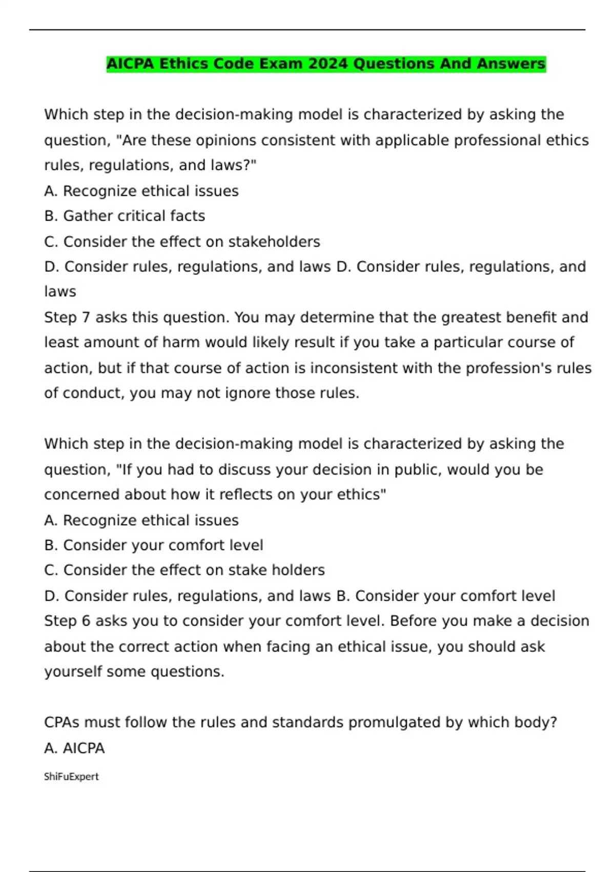 AICPA Ethics Code Exam 2024 Questions And Answers Which step in the decision-making model is characterized by asking the question, "Are these opinions consistent with applicable professional ethics rules, regulations, and laws?" A. Recognize ethical issues B. Gather critical facts C. Consider the effect on stakeholders D. Consider rules, regulations, and laws D. Consider rules, regulations, and laws Step 7 asks this question. You may determine that the greatest benefit and least amount of harm would likely result if you take a particular course of action, but if that course of action is inconsistent with the profession's rules of conduct, you may not ignore those rules. Which step in the decision-making model is characterized by asking the question, "If you had to discuss your decision in public, would you be concerned about how it reflects on your ethics" A. Recognize ethical issues B. Consider your comfort level C. Consider the effect on stake holders D. Consider rules, regulations, and laws B. Consider your comfort level Step 6 asks you to consider your comfort level. Before you make a decision about the correct action when facing an ethical issue, you should ask yourself some questions. CPAs must follow the rules and standards promulgated by which body? A. AICPA B. SEC C. PCAOB D. Your state CPA licensing board D. Your state CPA licensing board State CPA licensing boards are charged with issuing CPA licenses and overseeing the ethical conduct of CPAs in 55 jurisdictions in the United States. It is critically important for CPAs to know their state board's requirements. If you are licensed by more than one state board, you should familiarize yourself with each state's requirements. As a professional CPA, I have the greatest responsibility to serve: A. My clients B. My best interest C. The public's interest D. My superior's interest C. Your primary responsibility is to serve the public interest. As a professional CPA, I have a responsibility to maintain and broaden public confidence by performing all my responsibilities with: A. Integrity B. Speed C. Agility D. Perfection A. Integrity Integrity is one of the cornerstones of our profession.