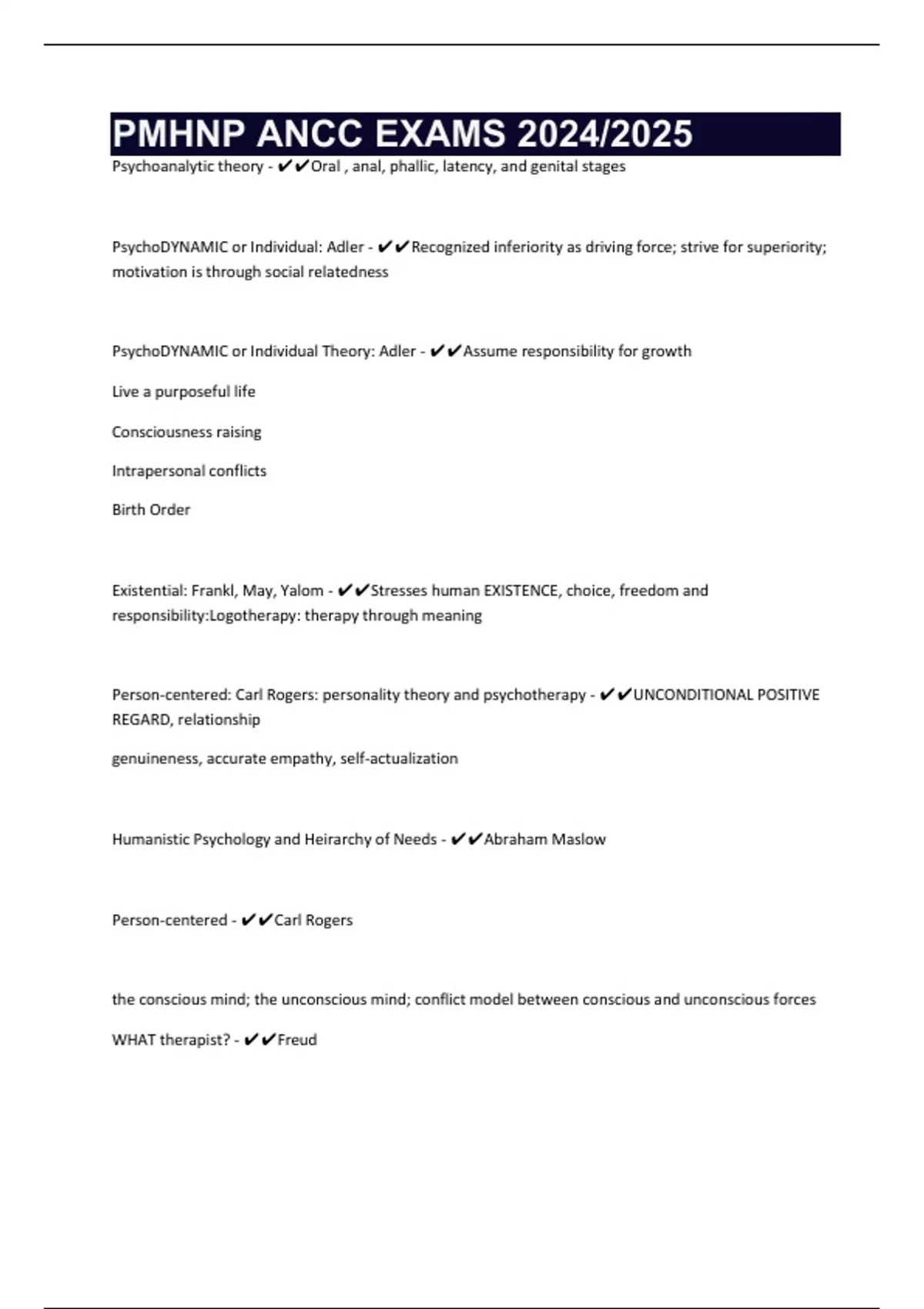 PsychoDYNAMIC or Individual: Adler - ✔✔Recognized inferiority as driving force; strive for superiority;