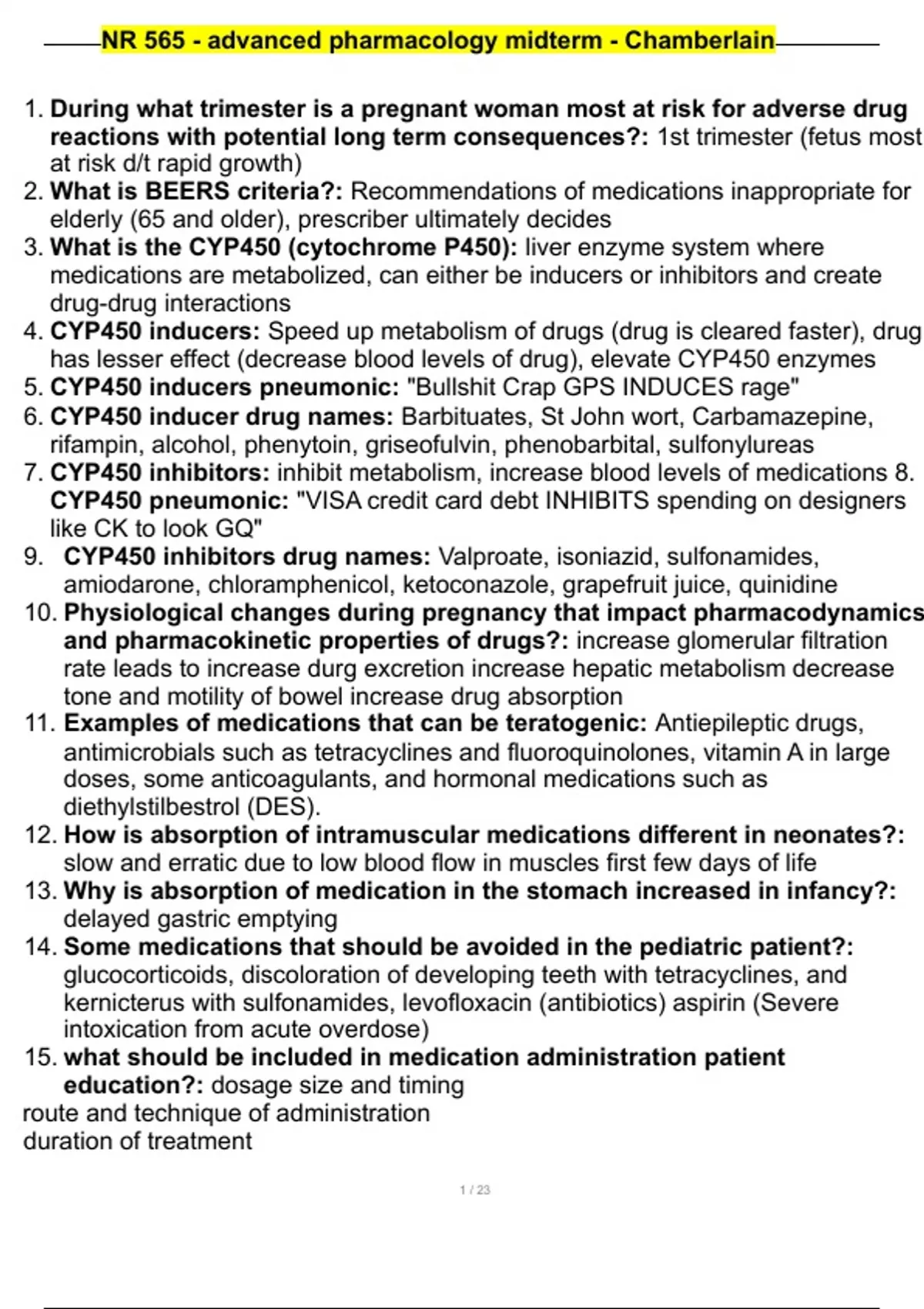 NR 565 - advanced pharmacology midterm - Chamberlain 2023/2024