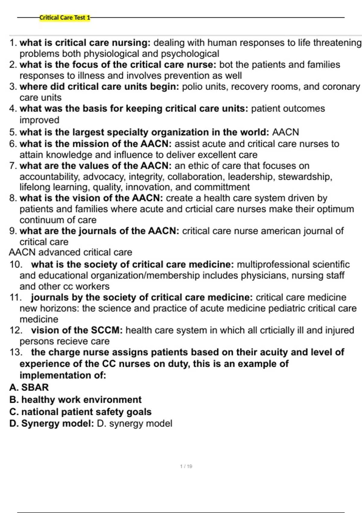 NR 340- critical care Exam 1 QUESTIONS WITH HIGHLIGHTED ANSWERS GRADED A+ (Latest 2022/2023) Chamberlain