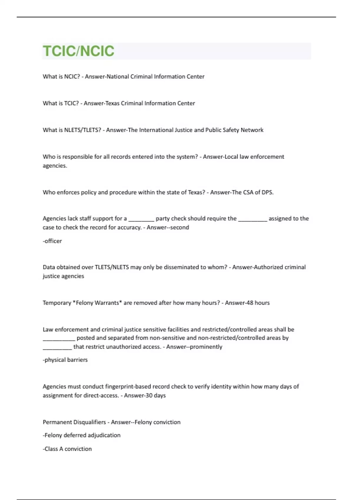 What is NCIC? - Answer-National Criminal Information Center What is TCIC? - Answer-Texas Criminal Information Center What is NLETS/TLETS? - Answer-The International Justice and Public Safety Network Who is responsible for all records entered into the system? - Answer-Local law enforcement agencies. Who enforces policy and procedure within the state of Texas? - Answer-The CSA of DPS. Agencies lack staff support for a ________ party check should require the _________ assigned to the case to check the record for accuracy. - Answer--second -officer Data obtained over TLETS/NLETS may only be disseminated to whom? - Answer-Authorized criminal justice agencies Temporary *Felony Warrants* are removed after how many hours? - Answer-48 hours Law enforcement and criminal justice sensitive facilities and restricted/controlled areas shall be __________ posted and separated from non-sensitive and non-restricted/controlled areas by _________ that restrict unauthorized access. - Answer--prominently -physical barriers Agencies must conduct fingerprint-based record check to verify identity within how many days of assignment for direct-access. - Answer-30 days Permanent Disqualifiers - Answer--Felony conviction -Felony deferred adjudication -Class A conviction-Class A deferred adjudication Disqualifier for 10 years - Answer--Class B conviction -Class B deferred adjudication What is the goal of NCIC? - Answer-To help the criminal justice community perform its duties by providing and maintaining *accurate* and *timely* information. How many active records and files does NCIC contain? - Answer--11.7 million records -21 files During *2011*, NCIC averaged how many transactions per day? - Answer-7.9 million