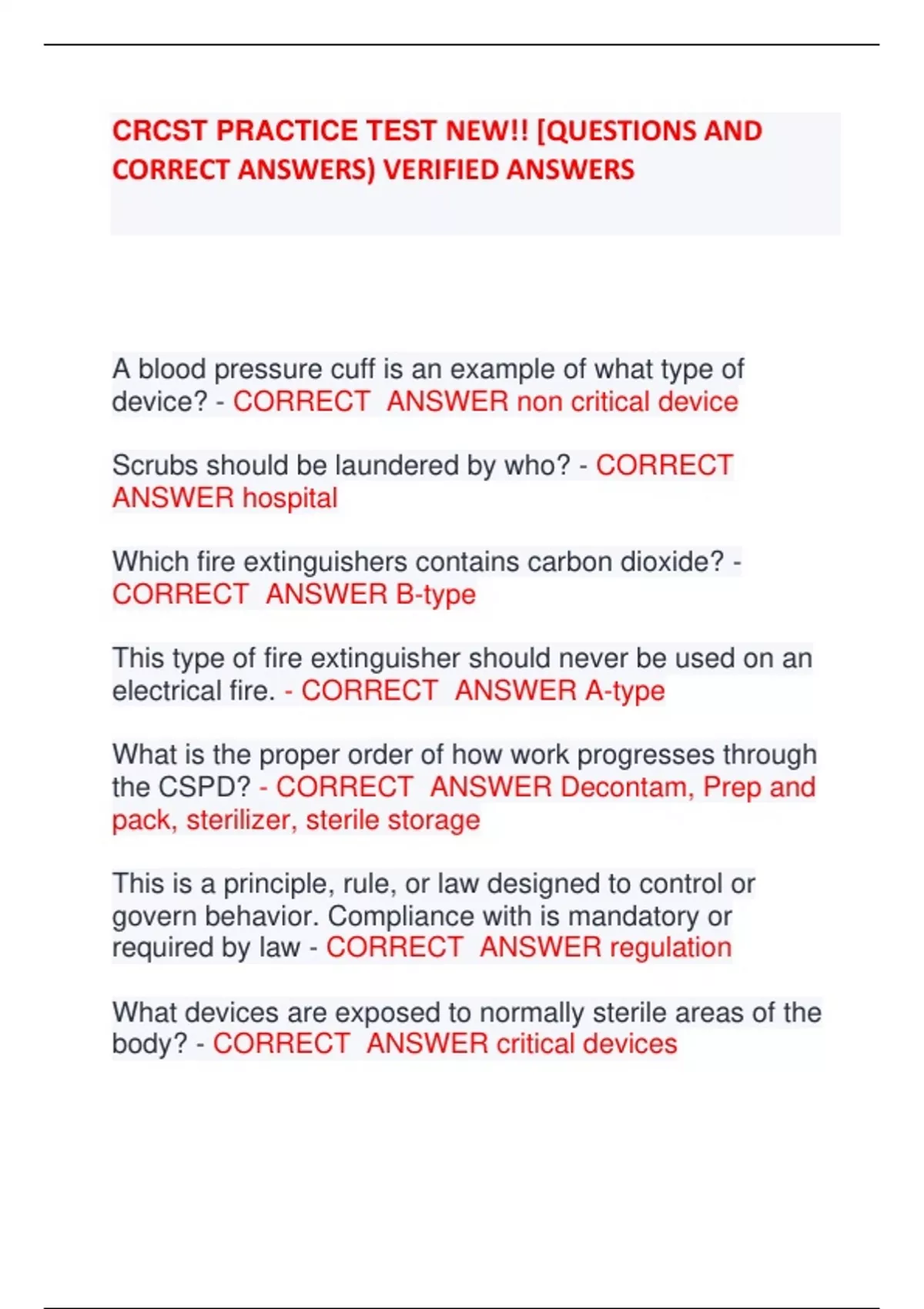 CRCST PRACTICE TEST NEW!! [QUESTIONS AND CORRECT ANSWERS) VERIFIED ANSWERS A blood pressure cuff is an example of what type of device? - CORRECT ANSWER non critical device Scrubs should be laundered by who? - CORRECT ANSWER hospital Which fire extinguishers contains carbon dioxide? - CORRECT ANSWER B-type This type of fire extinguisher should never be used on an electrical fire. - CORRECT ANSWER A-type What is the proper order of how work progresses through the CSPD? - CORRECT ANSWER Decontam, Prep and pack, sterilizer, sterile storage This is a principle, rule, or law designed to control or govern behavio