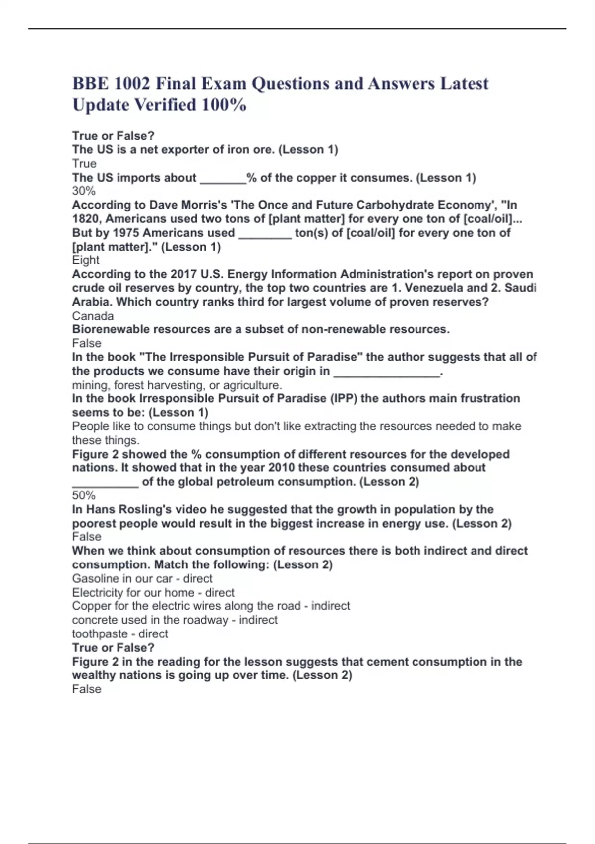 BBE 1002 Final Exam Questions and Answers Latest Update Verified 100% True or False? The US is a net exporter of iron ore. (Lesson 1) True The US imports about _______% of the copper it consumes. (Lesson 1) 30% According to Dave Morris's 'The Once and Future Carbohydrate Economy', "In 1820, Americans used two tons of [plant matter] for every one ton of [coal/oil]... But by 1975 Americans used ________ ton(s) of [coal/oil] for every one ton of [plant matter]." (Lesson 1) Eight According to the 2017 U.S. Energy Information Administration's report on proven crude oil reserves by country, the top two countries are 1. Venezuela and 2. Saudi Arabia. Which country ranks third for largest volume of proven reserves? Canada Biorenewable resources are a subset of non-renewable resources. False In the book "The Irresponsible Pursuit of Paradise" the author suggests that all of the products we consume have their origin in ________________. mining, forest harvesting, or agriculture. In the book Irresponsible Pursuit of Paradise (IPP) the authors main frustration seems to be: (Lesson 1) People like to consume things but don't like extracting the resources needed to make these things. Figure 2 showed the % consumption of different resources for the developed nations. It showed that in the year 2010 these countries consumed about __________ of the global petroleum consumption. (Lesson 2) 50% In Hans Rosling's video he suggested that the growth in population by the poorest people would result in the biggest increase in energy use. (Lesson 2) False When we think about consumption of resources there is both indirect and direct consumption. Match the following: (Lesson 2) Gasoline in our car - direct Electricity for our home - direct Copper for the electric wires along the road - indirect concrete used in the roadway - indirect toothpaste - direct True or False? Figure 2 in the reading for the lesson suggests that cement consumption in the wealthy nations is going up over time. (Lesson 2) False On average, each person in the US consumes about ________ lbs of mineral, metal, and fossil resources per year. (Lesson 2) about 40,000 lbs Globally consumption of minerals is about 12 tons per person per year. However, this is slightly misleading because (Lesson 2) wealthy developed countries consume much more and poorer countries consume much less. Assume the Proven Reserves of the mineral bambium are 50 tons and the consumption rate of bambium is 2 tons per year. What is the R/P ratio? (Lesson 2) 25 years What was the current R/P ratio for crude oil in 2010? (Lesson 2) about 43 years In the video Hans talked about the 4 billion people that live between the poverty line and "the airline". Of these 4 billion about how many people have washing machines? (Lesson 2) 1 billion Assume the world population at the end of 2017 was 7.4 billion people. The population growth rate in 2018 is 1.07%. How many more people were on the planet at the end of 2018? (Lesson 2) about 80 million more What are people most concerned about when they are arguing "Not in my backyard"? (Lesson 3) local environmental issues From the video, the taconite in the Mesabi formation contains about ___% iron. (Lesson 3) 30% What was one of the reasons, cited in the text, that there was a spike in oil prices in the 1970's? (Lesson 3) US oil production slowed What example was used to explain the concept 'it takes more resources to extract more resources"? (Lesson 3) Mountaintop coal mining Which of the following reasons were given for why countries import resources? (Lesson 3) It's cheaper because of cheap labor. There is no local supply. It's cheaper because of relaxed environmental regulations. Match the stages of life cycle. (Lesson 3) Mining of iron ore - Extraction Making steel from iron ore - Production Recycling a car - End of life Driving a car - Use Building a car - Production One of the big environmental issues with mining of metals is the tailing ponds. What are "tailings"? (Lesson 3) The leftover crushed rock after the metals are extracted. Which best describes the concept "it takes resources to extract resources"? (Lesson 3) It takes water and fossil fuels to extract minerals or fossil fuels. In Chapter 7 they cited a study that looked at the recycling rates of 60 different metals. They found that the recycling rate for over half of them was ___________. (Lesson 3) less than 1% Given that we don't want to mine new resources because of environmental damage, we have to find ways to reduce consumption. What did Chapter 7 say about steel recycling? (Lesson 3) There is a significant benefit in recycling steel. Figure 3 shows the carbon dioxide emissions to the atmosphere from the different sources. In 1900 the greatest CO2 emissions were from _________. (Lesson 4) Land Use Change True or False? Water vapor is considered a greenhouse gas. (Lesson 4) True The carbon cycle is drawn out in Figure 1. How much carbon is being emitted from human activity? (Lesson 4) 9 billion metric tons Plants take carbon dioxide out of the atmosphere because of photosynthesis. Living plants also put carbon dioxide back in the atmosphere through a process called _____________. (Lesson 4) respiration The topic of biorenewable resources draws on information from all over the world. As such, sometimes the measurements we use are in metric (e.g. kilogram, meter) and other times standard units (e.g. lbs, feet). Anything about the carbon cycle is done in the metric system. "Tons" in the carbon cycle refers to metric tons. How much is a metric ton? (Lesson 4) 1000 kilograms The cool graphic on carbon dioxide concentrations over time (since like 800,000 BCE) showed some interesting things. What was the approximate concentration of CO2 in the atmosphere in 1979? (Lesson 4) 330 ppm If you watch the animation called "Pumphandle", it tracks CO2 concentrations back 800,000 years. In the animation, pre-industrial concentrations were about ___________. (Lesson 4) 280 ppm In the NASA vi