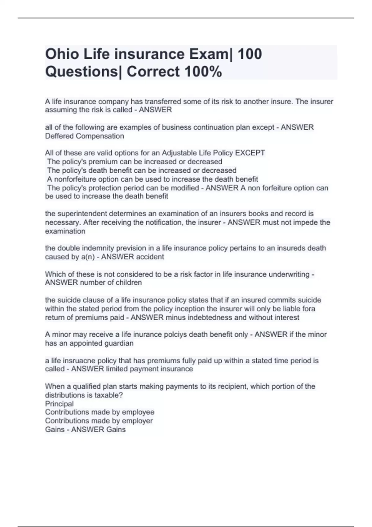 A life insurance company has transferred some of its risk to another insure. The insurer assuming the risk is called - ANSWER all of the following are examples of business continuation plan except - ANSWER Deffered Compensation All of these are valid options for an Adjustable Life Policy EXCEPT The policy's premium can be increased or decreased The policy's death benefit can be increased or decreased A nonforfeiture option can be used to increase the death benefit The policy's protection period can be modified - ANSWER A non forfeiture option can be used to increase the death benefit the superintendent determines an examination of an insurers books and record is necessary. After receiving the notification, the insurer - ANSWER must not impede the examination the double indemnity prevision in a life insurance policy pertains to an insureds death caused by a(n) - ANSWER accident Which of these is not considered to be a risk factor in life insurance underwriting - ANSWER number of children the suicide clause of a life insurance policy states that if an insured commits suicide within the stated period from the policy inception the insurer will only be liable fora return of premiums paid - ANSWER minus indebtedness and without interest A minor may receive a life inurance polciys death benefit only - ANSWER if the minor has an appointed guardian a life insruacne policy that has premiums fully paid up within a stated time period is called - ANSWER limited payment insurance When a qualified plan starts making payments to its recipient, which portion of the distributions is taxable? Principal Contributions made by employee Contributions made by employer Gains - ANSWER Gains