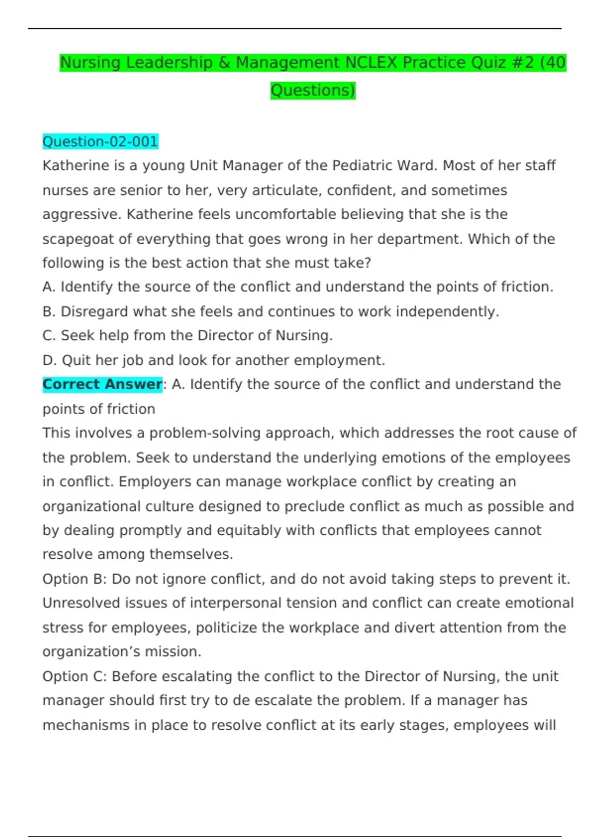 Nursing Leadership & Management NCLEX Practice Quiz #2 (40 Questions) Question-02-001 Katherine is a young Unit Manager of the Pediatric Ward. Most of her staff nurses are senior to her, very articulate, confident, and sometimes aggressive. Katherine feels uncomfortable believing that she is the scapegoat of everything that goes wrong in her department. Which of the following is the best action that she must take? A. Identify the source of the conflict and understand the points of friction. B. Disregard what she feels and continues to work independently. C. Seek help from the Director of Nursing. D. Quit her job and look for another employment. Correct Answer: A. Identify the source of the conflict and understand the points of friction This involves a problem-solving approach, which addresses the root cause of the problem. Seek to understand the underlying emotions of the employees in conflict. Employers can manage workplace conflict by creating an organizational culture designed to preclude conflict as much as possible and by dealing promptly and equitably with conflicts that employees cannot resolve among themselves. Option B: Do not ignore conflict, and do not avoid taking steps to prevent it. Unresolved issues of interpersonal tension and conflict can create emotional stress for employees, politicize the workplace and divert attention from the organization’s mission. Option C: Before escalating the conflict to the Director of Nursing, the unit manager should first try to de escalate the problem. If a manager has mechanisms in place to resolve conflict at its early stages, employees will generally see their employer as fair in their dealings with them and will likely be more satisfied with their jobs. Option D: If the manager does not act, conflicts will escalate into larger problems, discrimination and harassment complaints may increase, and the employer’s reputation could be damaged. When employees mistrust management or perceive the organization as acting unfairly, turnover may increase. This can lead to recruiting and training expenses for new hires and the costs attributable to slippage of performance until new employees become fully proficient in their jobs. Question-02-002 As a young manager, she knows that conflict occurs in any organization. Which of the following statements regarding conflict is not true? A. Can be destructive if the level is too high. B. Is not beneficial; hence it should be prevented at all times. C. May result in poor performance. D. May create leaders. Correct Answer: B. Is not beneficial; hence it should be prevented at all times. Conflicts are beneficial because it surfaces out issues in the open and can be solved right away. Likewise, members of the team become more conscientious with their work when they are aware that other members of the team are watching them. What conflicts do is that they encourage debate and competition which is good for almost any environment. Also, it improves team culture and allows people to learn more. Option A: The most obvious disadvantage of conflict is the toll on emotions. When employees feel they are being bullied, taken advantage of, or facing favoritism, they may begin looking for another job or performing poorly. Conflicts between departments can disrupt production, and result in lost business or customers. Option C: Unscheduled absences drive up employers’ costs through benefits outlays, the use of replacement workers, higher stress levels among employees, and a decrease in overall employee performance. Option D: With more workplace conflicts, the team may accomplish its goals in no time. This does sound surprising to most of us but it is very true. Conflicts are a vital part of work culture and they nourish the minds in several ways. Question-02-003 Katherine tells one of the staff, “I don’t have time to discuss the matter with you now. See me in my office later” when the latter asks if they can talk about an issue. Which of the following conflict resolution strategies did she use? A. Smoothing B. Compromise C. Avoidance D. Restriction Correct Answer: C. Avoidance