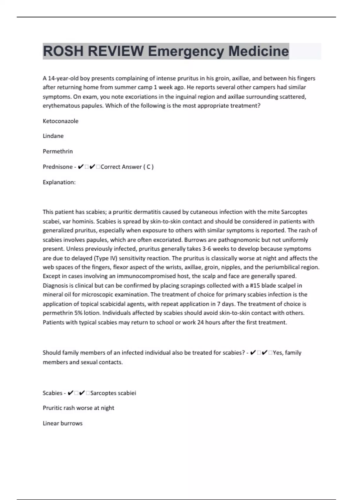 A 14-year-old boy presents complaining of intense pruritus in his groin, axillae, and between his fingers after returning home from summer camp 1 week ago. He reports several other campers had similar symptoms. On exam, you note excoriations in the inguinal region and axillae surrounding scattered, erythematous papules. Which of the following is the most appropriate treatment? Ketoconazole Lindane Permethrin Prednisone - ️️Correct Answer ( C ) Explanation: This patient has scabies; a pruritic dermatitis caused by cutaneous infection with the mite Sarcoptes scabei, var hominis. Scabies is spread by skin-to-skin contact and should be considered in patients with generalized pruritus, especially when exposure to others with similar symptoms is reported. The rash of scabies involves papules, which are often excoriated. Burrows are pathognomonic but not uniformly present. Unless previously infected, pruritus generally takes 3-6 weeks to develop because symptoms are due to delayed (Type IV) sensitivity reaction. The pruritus is classically worse at night and affects the web spaces of the fingers, flexor aspect of the wrists, axillae, groin, nipples, and the periumbilical region. Except in cases involving an immunocompromised host, the scalp and face are generally spared. Diagnosis is clinical but can be confirmed by placing scrapings collected with a #15 blade scalpel in mineral oil for microscopic examination. The treatment of choice for primary scabies infection is the application of topical scabicidal agents, with repeat application in 7 days. The treatment of choice is permethrin 5% lotion. Individuals affected by scabies should avoid skin-to-skin contact with others. Patients with typical scabies may return to school or work 24 hours after the first treatment. Should family members of an infected individual also be treated for scabies? - ️️Yes, family members and sexual contacts. Scabies - ️️Sarcoptes scabiei Pruritic rash worse at night Linear burrows Interdigital spaces of hands/feet, penis, breasts Permethrin (first line) Ivermectin