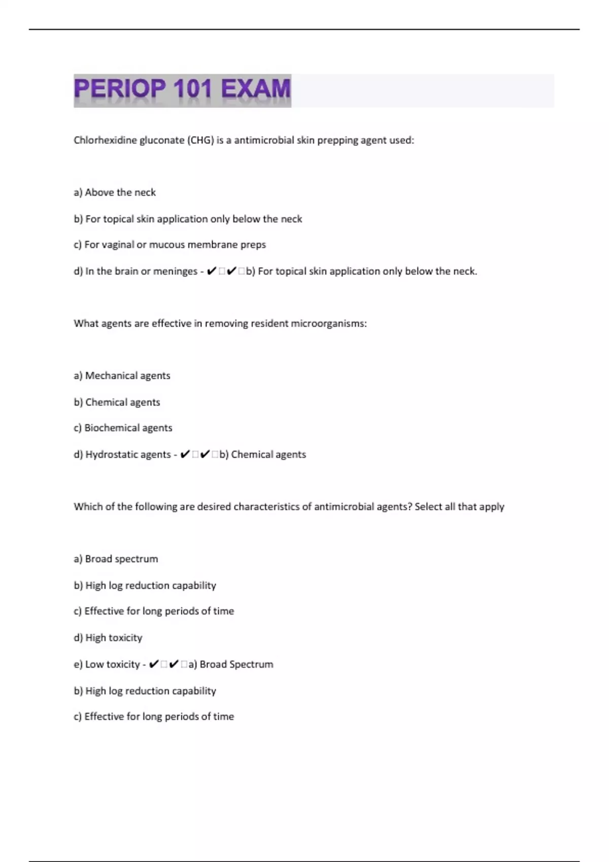 Chlorhexidine gluconate (CHG) is a antimicrobial skin prepping agent used: a) Above the neck b) For topical skin application only below the neck c) For vaginal or mucous membrane preps d) In the brain or meninges - ️️b) For topical skin application only below the neck. What agents are effective in removing resident microorganisms: a) Mechanical agents b) Chemical agents c) Biochemical agents d) Hydrostatic agents - ️️b) Chemical agents Which of the following are desired characteristics of antimicrobial agents? Select all that apply a) Broad spectrum b) High log reduction capability c) Effective for long periods of time d) High toxicity e) Low toxicity - ️️a) Broad Spectrum b) High log reduction capability c) Effective for long periods of time