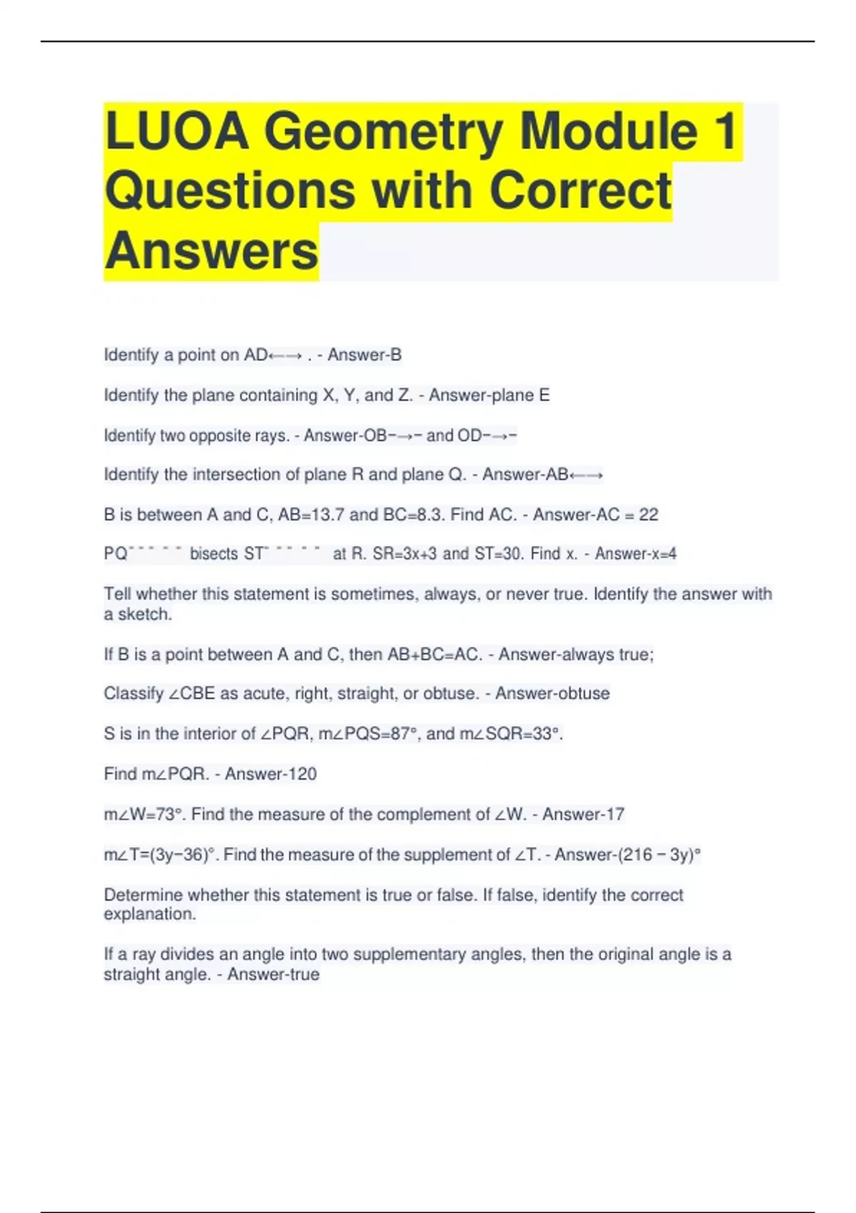 LUOA Geometry Module 1 Questions with Correct Answers Identify a point on AD←→ . - Answer-B Identify the plane containing X, Y, and Z. - Answer-plane E Identify two opposite rays. - Answer-OB−→− and OD−→− Identify the intersection of plane R and plane Q. - Answer-AB←→ B is between A and C, AB=13.7 and BC=8.3. Find AC. - Answer-AC = 22 PQ¯¯¯ ¯ ¯ bisects ST¯ ¯¯ ¯ ¯ at R. SR=3x+3 and ST=30. Find x. - Answer-x=4 Tell whether this statement is sometimes, always, or never true. Identify the answer with a sketch. If B is a point between A and C, then AB+BC=AC. - Answer-always true; Classify ∠CBE as acute, right, straight, or obtuse. - Answer-obtuse S is in the interior of ∠PQR, m∠PQS=87°, and m∠SQR=33°. Find m∠PQR. - Answer-120 m∠W=73°. Find the measure of the complement of ∠W. - Answer-17 m∠T=(3y−36)°. Find the measure of the supplement of ∠T. - Answer-(216 − 3y)° Determine whether this statement is true or false. If false, identify the correct explanation. If a ray divides an angle into two supplementary angles, then the original angle is a straight angle. - Answer-true
