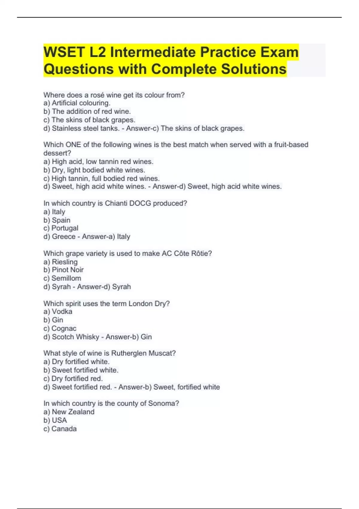 WSET L2 Intermediate Practice Exam Questions with Complete Solutions Where does a rosé wine get its colour from? a) Artificial colouring. b) The addition of red wine. c) The skins of black grapes. d) Stainless steel tanks. - Answer-c) The skins of black grapes. Which ONE of the following wines is the best match when served with a fruit-based dessert? a) High acid, low tannin red wines. b) Dry, light bodied white wines. c) High tannin, full bodied red wines. d) Sweet, high acid white wines. - Answer-d) Sweet, high acid white wines. In which country is Chianti DOCG produced? a) Italy b) Spain c) Portugal d) Greece - Answer-a) Italy Which grape variety is used to make AC Côte Rôtie? a) Riesling b) Pinot Noir c) Semillom d) Syrah - Answer-d) Syrah Which spirit uses the term London Dry? a) Vodka b) Gin c) Cognac d) Scotch Whisky - Answer-b) Gin What style of wine is Rutherglen Muscat? a) Dry fortified white. b) Sweet fortified white. c) Dry fortified red. d) Sweet fortified red. - Answer-b) Sweet, fortified white In which country is the county of Sonoma? a) New Zealand b) USA c) Canada d) South Africia - Answer-b) USA Which gas is given off during alcoholic fermentation? a) Sulfur Dioxide b) Nitrogen Dioxide c) Carbon Dioxide d) Hydrogen Dioxide - Answer-c) Carbon Dioxide Which ONE of the following is the most important grape variety in Argentina? a) Gewurztraminer b) Nebbiolo c) Malbec d) Grenache - Answer-c) Malbec Which ONE of the following pairs is CORRECTLY matched? a) Vouvray & Italy b) Beaujolais & Bordeaux c) Mersault & Portugal d) Tempranillo & Rioja - Answer-d) Tempranillo & Rioja