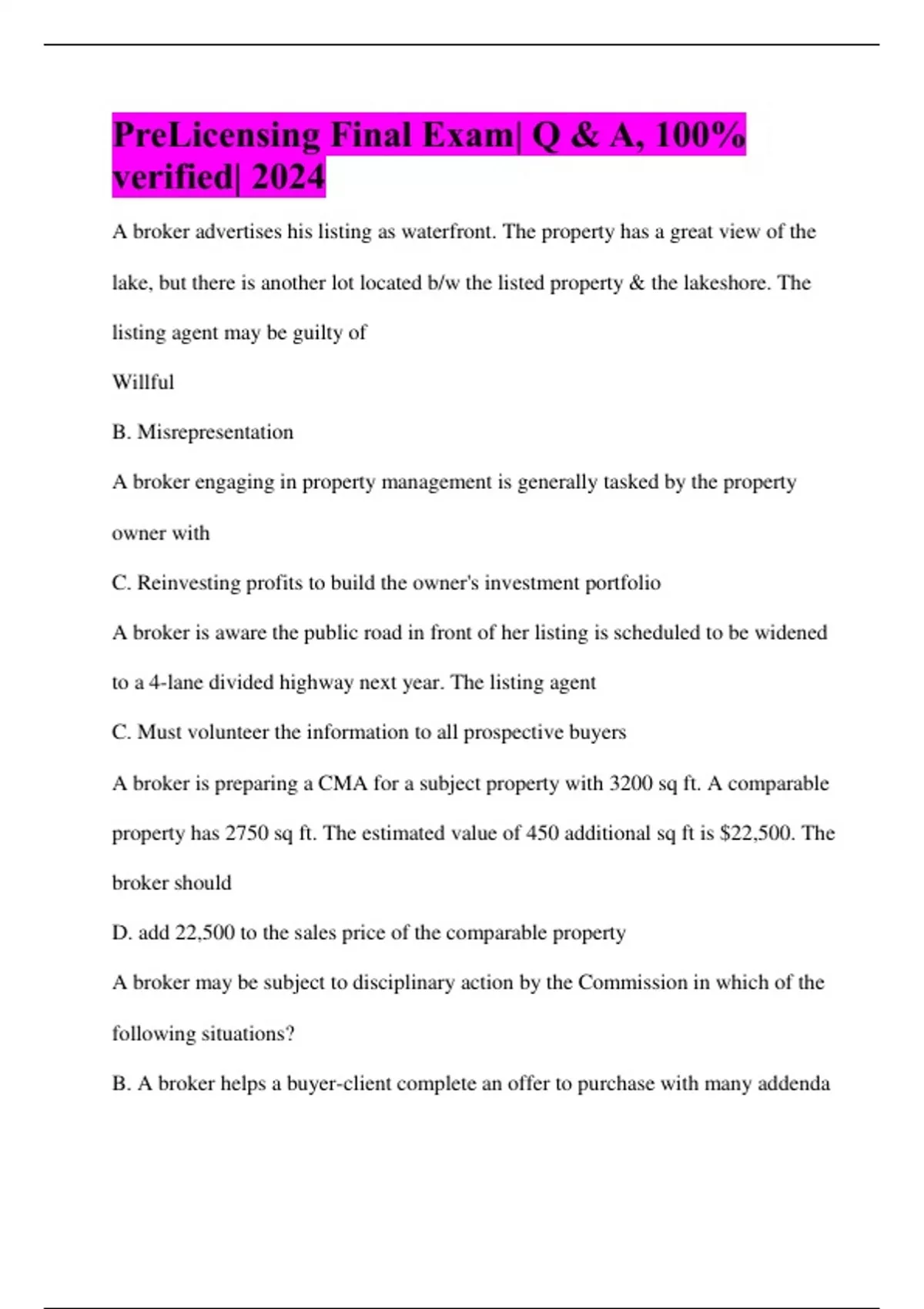PreLicensing Final Exam| Q & A, 100% verified| 2024 PreLicensing Final Exam| Q & A, 100% verified| 2024 A broker advertises his listing as waterfront. The property has a great view of the lake, but there is another lot located b/w the listed property & the lakeshore. The listing agent may be guilty of Willful B. Misrepresentation A broker engaging in property management is generally tasked by the property owner with C. Reinvesting profits to build the owner's investment portfolio A broker is aware the public road in front of her listing is scheduled to be widened to a 4-lane divided highway next year. The listing agent C. Must volunteer the information to all prospective buyers A broker is preparing a CMA for a subject property with 3200 sq ft. A comparable property has 2750 sq ft. The estimated value of 450 additional sq ft is $22,500. The broker should D. add 22,500 to the sales price of the comparable property A broker may be subject to disciplinary action by the Commission in which of the following situations? B. A broker helps a buyer-client complete an offer to purchase with many addenda A broker obtains an exclusive right to sell listing for her company. What is the agency relationship b/w the owner of the listing and all the brokers that work for the company? B. Seller Subagency A buyer agent must disclose to the seller or the seller's agent that the broker represents the buyer. A. At the buyer agent's initial contact with the seller or seller's agent A buyer has contracted to purchase a home for $275,000. The buyer paid $4,000 earnest money deposit and the sale will close on March 30. The buyer has already received loan approval for an 80% loan-to-value conventional loan. The lender is charging the borrower a 1% loan origination fee and 1/2 discount points. The lender is requiring the borrower to deposit 7 months of real property taxes and 2 months of homeowner insurance premium into an escrow account at settlement. The homeowner insurance premium for the first year is $864 and is to be paid at settlement. Real property taxes for the year total $3635 and have not been paid for the current year. For prorations, use a 30-day month/360-day year & assume the seller owns the day of settlement. Additional closing expense for the buyer total $1500. What is the net amount that the buyer will owe at settlement, rounded to the nearest dollar?
