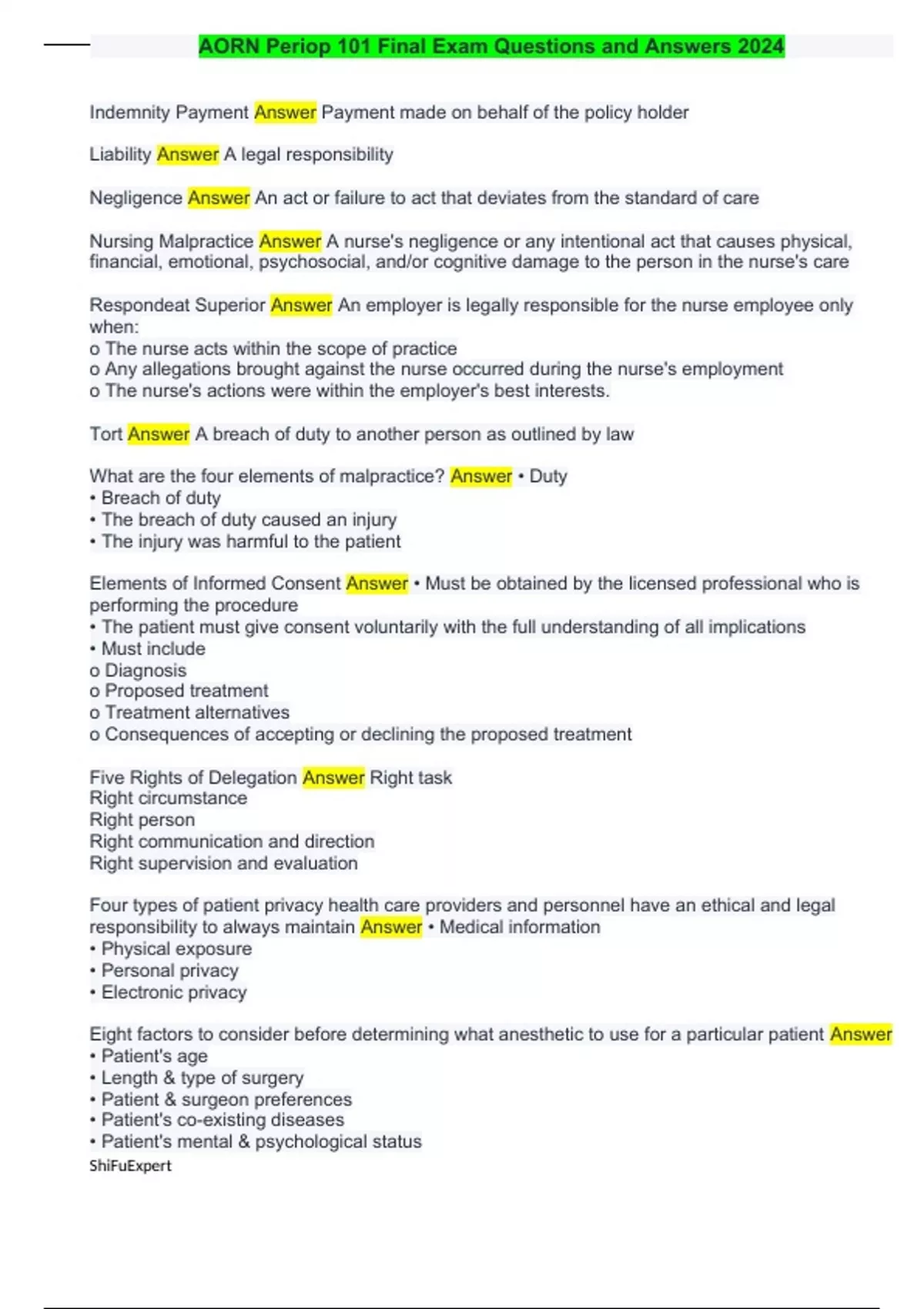 AORN Periop 101 Final Exam Questions and Answers 2024 Indemnity Payment Answer Payment made on behalf of the policy holder Liability Answer A legal responsibility Negligence Answer An act or failure to act that deviates from the standard of care Nursing Malpractice Answer A nurse's negligence or any intentional act that causes physical, financial, emotional, psychosocial, and/or cognitive damage to the person in the nurse's care Respondeat Superior Answer An employer is legally responsible for the nurse employee only when: o The nurse acts within the scope of practice o Any allegations brought against the nurse occurred during the nurse's employment o The nurse's actions were within the employer's best interests. Tort Answer A breach of duty to another person as outlined by law What are the four elements of malpractice? Answer • Duty • Breach of duty • The breach of duty caused an injury • The injury was harmful to the patient Elements of Informed Consent Answer • Must be obtained by the licensed professional who is performing the procedure • The patient must give consent voluntarily with the full understanding of all implications • Must include o Diagnosis o Proposed treatment o Treatment alternatives o Consequences of accepting or declining the proposed treatment Five Rights of Delegation Answer Right task Right circumstance Right person Right communication and direction Right supervision and evaluation Four types of patient privacy health care providers and personnel have an ethical and legal responsibility to always maintain Answer • Medical information • Physical exposure • Personal privacy • Electronic privacy Eight factors to consider before determining what anesthetic to use for a particular patient Answer • Patient's age • Length & type of surgery • Patient & surgeon preferences • Patient's co-existing diseases • Patient's mental & psychological status
