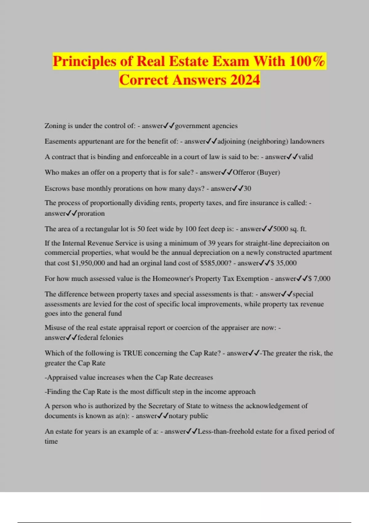 Principles of Real Estate Exam With 100% Correct Answers 2024 Zoning is under the control of: - answergovernment agencies Easements appurtenant are for the benefit of: - answeradjoining (neighboring) landowners A contract that is binding and enforceable in a court of law is said to be: - answervalid Who makes an offer on a property that is for sale? - answerOfferor (Buyer) Escrows base monthly prorations on how many days? - answer30 The process of proportionally dividing rents, property taxes, and fire insurance is called: - answerproration The area of a rectangular lot is 50 feet wide by 100 feet deep is: - answer5000 sq. ft. If the Internal Revenue Service is using a minimum of 39 years for straight-line depreciaiton on commercial properties, what would be the annual depreciation on a newly constructed apartment that cost $1,950,000 and had an orginal land cost of $585,000? - answer$ 35,000 For how much assessed value is the Homeowner's Property Tax Exemption - answer$ 7,000 The difference between property taxes and special assessments is that: - answerspecial assessments are levied for the cost of specific local improvements, while property tax revenue goes into the general fund Misuse of the real estate appraisal report or coercion of the appraiser are now: - answerfederal felonies Which of the following is TRUE concerning the Cap Rate? - answer-The greater the risk, the greater the Cap Rate -Appraised value increases when the Cap Rate decreases -Finding the Cap Rate is the most difficult step in the income approach A person who is authorized by the Secretary of State to witness the acknowledgement of documents is known as a(n): - answernotary public An estate for years is an example of a: - answerLess-than-freehold estate for a fixed period of time A broker who mixes personal funds with his or her principal's funds is guilty of: - answercommingling The Real Estate Commissioner enforces provisions of the: - answerReal Estate Law Real property consist of: - answer-Land and structures on the land -Anything incidental to the land -Anything appurtenant to the land Determining the present value of a property based upon its anticipated future income and expenses is called the: - answercapitalization or income approach which of the following is NOT one of the forces that affect the value of a neighborhood? - answerPast sales considerations The right to reasonable use of water from a river or stream, if the land borders it, is called: - answera riparian right The federal civil rights law that applies to Americans with disabilities and protects them from discrimination is the: - answerAmericans With Disabilities Act A zoning act that requires disclosure of a property's vicinity to hazardous earthquake faults is known as: - answerAlquist-Priolo Special Studies Zones Act When prices rise due to shortages of available properties, it is known as a: - answerseller's market The higher your credit score: - answerthe better your interest rate and loan terms Other than the initial small deposit to open the account, when are money deposits the personal property of the broker? - answerNeve