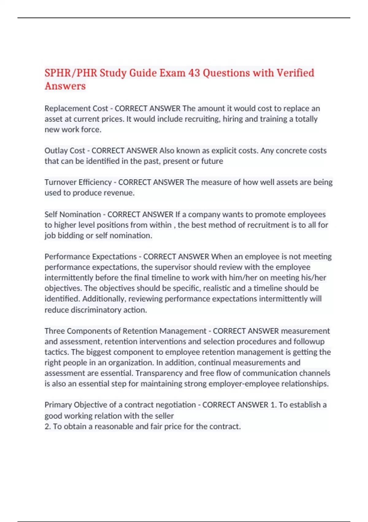 SPHR/PHR Study Guide Exam 43 Questions with Verified Answers Replacement Cost - CORRECT ANSWER The amount it would cost to replace an asset at current prices. It would include recruiting, hiring and training a totally new work force. Outlay Cost - CORRECT ANSWER Also known as explicit costs. Any concrete costs that can be identified in the past, present or future Turnover Efficiency - CORRECT ANSWER The measure of how well assets are being used to produce revenue. Self Nomination - CORRECT ANSWER If a company wants to promote employees to higher level positions from within , the best method of recruitment is to all for job bidding or self nomination. Performance Expectations - CORRECT ANSWER When an employee is not meeting performance expectations, the supervisor should review with the employee intermittently before the final timeline to work with him/her on meeting his/her objectives. The objectives should be specific, realistic and a timeline should be identified. Additionally, reviewing performance expectations intermittently will reduce discriminatory action. Three Components of Retention Management - CORRECT ANSWER measurement and assessment, retention interventions and selection procedures and followup tactics. The biggest component to employee retention management is getting the right people in an organization. In addition, continual measurements and assessment are essential. Transparency and free flow of communication channels is also an essential step for maintaining strong employer-employee relationships. Primary Objective of a contract negotiation - CORRECT ANSWER 1. To establish a good working relation with the seller 2. To obtain a reasonable and fair price for the contract. Sunset Clause - CORRECT ANSWER Identifies a time period after the defined end of an incentive pay plan. Golden Handcuffs - CORRECT ANSWER Represents employee incentives linked to an individual's continued employment with an organization so that key performers have strong incentives to stay with the organization due to significant losses if they were to leave. Expert Power - CORRECT ANSWER When important employees demand an increase in pay because they know they are invaluable to the organization due to their level of expertise or skill set. Recognition and Rewards - CORRECT ANSWER Recognition and rewards are used to promote team performance and reinforce desired behaviors. To be effective, recognition and rewards should be based on activities under a persons control and clear criteria for rewards should be established. Improves team cohesiveness. Zero Sum Rewards - CORRECT ANSWER Undermines/ Limits team cohesiveness due to limited number of project team members being recognized for their work. Line Managers - CORRECT ANSWER Line managers are primarily responsible for managing human resources/ employees. However, human resource professionals provide special expertise and tools that assist line managers in managing their direct report employees. Test/Retests, Internal Consistency, Parallel Forms - CORRECT ANSWER All measure reliability. Reliability is the ability of an instrument to measure consistency with relative absence of error. Unit Strategy - CORRECT ANSWER Business unit strategy is concerned more with how a business competes successfully in a particular market. It is concerned with making strategic decisions about choice of products, meeting needs of the customers, gaining advantage over competitors, exploiting or creating new opportunities. Corporate Strategy - CORRECT ANSWER Corporate strategy is concerned with the overall purpose and scope of the business to meet stakeholder expectations. It is often explicitly stated in the corporate mission. Functional Strategy - CORRECT ANSWER Functional strategy emphasizes short and medium term plans and is limited to the domain of each department's functional responsibility. Corporate Vision - CORRECT ANSWER Represents the overall goal of an organization that all business activities and processes should contribute toward achieving. It is explicitly stated in the vision statement. Structured Exercise - CORRECT ANSWER Enables the participants to practice the newly learned skills. A structured exercise would be most effective method of improving the effectiveness. For example the time it takes to ring up customers at a cash register. Application Falsification and Ramifications - CORRECT ANSWER An employee who knowingly falsifies the reason for termination with another employer ( Misconduct being the reason for termination) should be fired immediately when the new employer finds out. Even if details are unknown prior to dismissal. If such an action has been done once, then it is likely that the employee can falsify the information again. Gainsharing - CORRECT ANSWER Group incentive programs where gains realized from group endeavors are shared with the group. Piece Rate Plan - CORRECT ANSWER Individual incentive plan where individuals are compensated for piecework. Profit Sharing Plans - CORRECT ANSWER Organization wide incentive programs that allow employees the right to reap direct benefits from profitability of the organization. Commissions - CORRECT ANSWER Individual incentive plans that base compensation on a percentage of sales. Central Tendency and Job Performance - CORRECT ANSWER Central Tendency is the tendency to centralize performance appraisal scores around a small range, regardless of actual performance. Skip Level Interviews - CORRECT ANSWER Allow time for directors to receive feedback from their employees directly, specifically those employees that are two levels below them. Situational Theories - CORRECT ANSWER Believe that leadership styles should correspond to the maturity of the employees. Behavioral Theories - CORRECT ANSWER Believe that leadership can be learned. Individuals can learn the necessary behaviors to be effective leaders. Trait Theories - CORRECT ANSWER Trait Theories believe that leaders are born not made. According to this theor