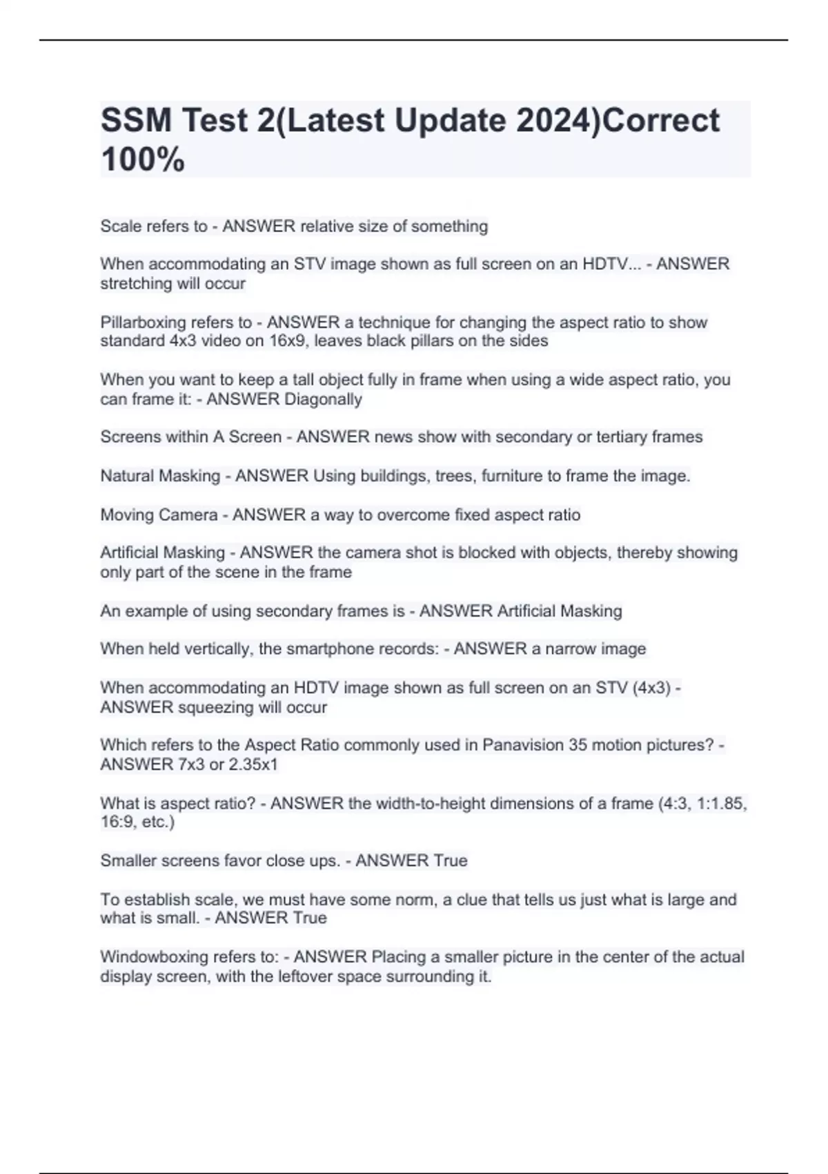 Scale refers to - ANSWER relative size of something When accommodating an STV image shown as full screen on an HDTV... - ANSWER stretching will occur Pillarboxing refers to - ANSWER a technique for changing the aspect ratio to show standard 4x3 video on 16x9, leaves black pillars on the sides When you want to keep a tall object fully in frame when using a wide aspect ratio, you can frame it: - ANSWER Diagonally Screens within A Screen - ANSWER news show with secondary or tertiary frames Natural Masking - ANSWER Using buildings, trees, furniture to frame the image. Moving Camera - ANSWER a way to overcome fixed aspect ratio Artificial Masking - ANSWER the camera shot is blocked with objects, thereby showing only part of the scene in the frame An example of using secondary frames is - ANSWER Artificial Masking When held vertically, the smartphone records: - ANSWER a narrow image When accommodating an HDTV image shown as full screen on an STV (4x3) - ANSWER squeezing will occur Which refers to the Aspect Ratio commonly used in Panavision 35 motion pictures? - ANSWER 7x3 or 2.35x1 What is aspect ratio? - ANSWER the width-to-height dimensions of a frame (4:3, 1:1.85, 16:9, etc.) Smaller screens favor close ups. - ANSWER True To establish scale, we must have some norm, a clue that tells us just what is large and what is small. - ANSWER True Windowboxing refers to: - ANSWER Placing a smaller picture in the center of the actual display screen, with the leftover space surrounding it.