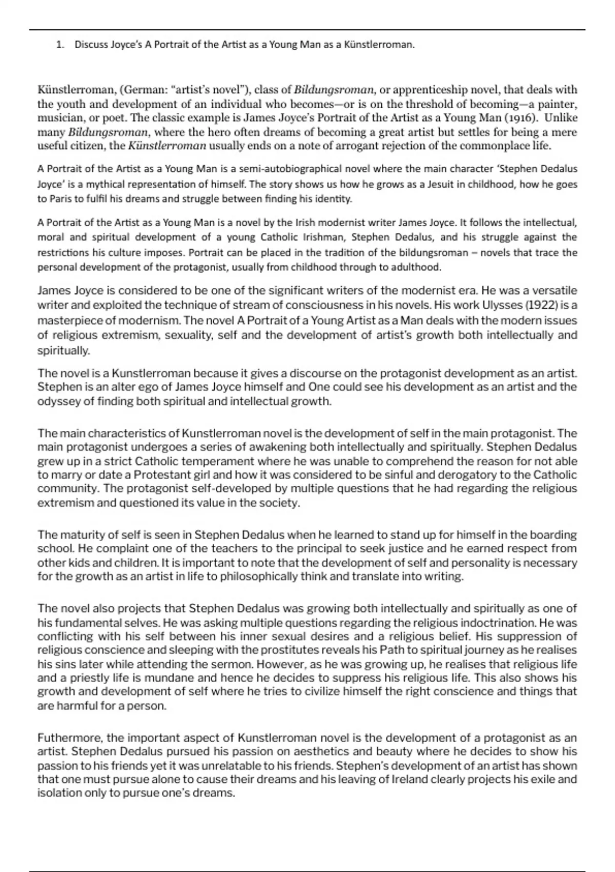 1. Discuss Joyce’s A Portrait of the Artist as a Young Man as a Künstlerroman.