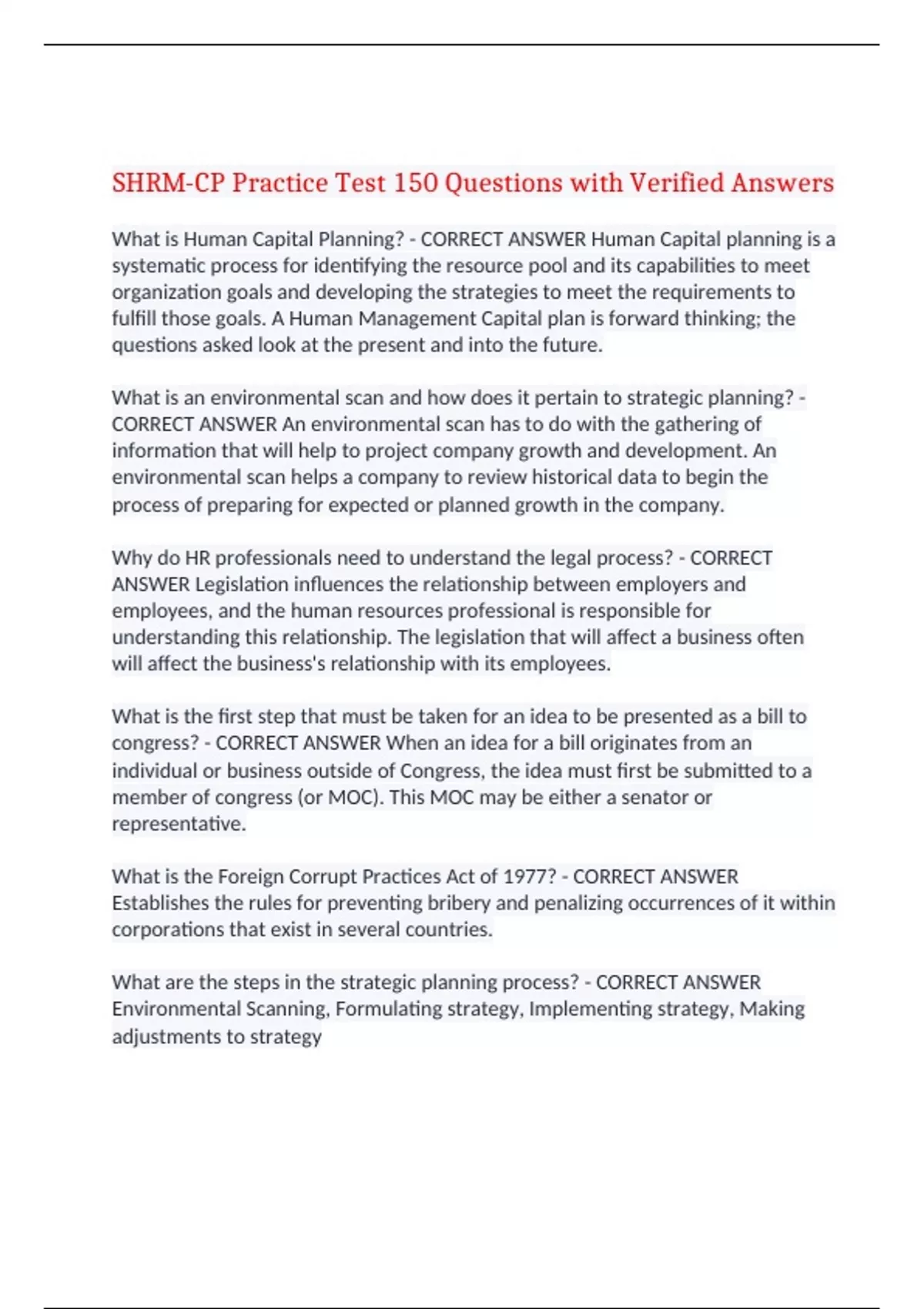 SHRM-CP Practice Test 150 Questions with Verified Answers What is Human Capital Planning? - CORRECT ANSWER Human Capital planning is a systematic process for identifying the resource pool and its capabilities to meet organization goals and developing the strategies to meet the requirements to fulfill those goals. A Human Management Capital plan is forward thinking; the questions asked look at the present and into the future. What is an environmental scan and how does it pertain to strategic planning? - CORRECT ANSWER An environmental scan has to do with the gathering of information that will help to project company growth and development. An environmental scan helps a company to review historical data to begin the process of preparing for expected or planned growth in the company. Why do HR professionals need to understand the legal process? - CORRECT ANSWER Legislation influences the relationship between employers and employees, and the human resources professional is responsible for understanding this relationship. The legislation that will affect a business often will affect the business's relationship with its employees. What is the first step that must be taken for an idea to be presented as a bill to congress? - CORRECT ANSWER When an idea for a bill originates from an individual or business outside of Congress, the idea must first be submitted to a member of congress (or MOC). This MOC may be either a senator or representative. What is the Foreign Corrupt Practices Act of 1977? - CORRECT ANSWER Establishes the rules for preventing bribery and penalizing occurrences of it within corporations that exist in several countries. What are the steps in the strategic planning process? - CORRECT ANSWER Environmental Scanning, Formulating strategy, Implementing strategy, Making adjustments to strategy Democratic Leadership Style: - CORRECT ANSWER a type of leadership style in which members of the group take a more participative role in the decision-making process. Coaching Leadership Style: - CORRECT ANSWER Coaching leaders are very effective in settings where performance or results need improvement. They help others to advance their skills; they build bench strength, and provide a lot of guidance. The coaching leadership style is most effective when followers are more responsible, experienced, and agreeable. Transactional Leadership Style: - CORRECT ANSWER a style of leadership that focuses on supervision, organization, and performance; transactional leadership is a style of leadership in which leaders promote compliance by followers through both rewards and punishments. Transformational Leadership Style: - CORRECT ANSWER a style of leadership where a leader works with subordinates to identify needed change, creating a vision to guide the change through inspiration, and executing the change in tandem with committed members of a group. What standard budget responsibilities does HR have? - CORRECT ANSWER Payroll taxes, travel expenses, repairs and maintenance, & employee benefits. The FLSA retains a certification of age for all employees for how long? - CORRECT ANSWER Until their employment is terminated. When is a company required to pay their employee more than the federal minimum wage? - CORRECT ANSWER When state minimum wage is higher than the federal minimum wage, the company is required to pay the state minimum wage over the federal . What is adverse impact? - CORRECT ANSWER The phrase adverse impact or unintentional discrimination refers to the selection rate of the a protected class being less than 80% of the selection rate of the highest group. What's involved in the human resources professional's analysis of staffing needs? - CORRECT ANSWER Create a list of necessary KSAs that will encourage company growth, Develop a list of employees who might be ready for promotion, Consider various hiring options for any open positions, as well as positions that will be open in the near future, and Review the results of past hiring decisions to increase the potential success of future decisions. Short-form Application - CORRECT ANSWER Consists of a pre-made form designed to obtain general information. Short-form applications are best used for positions that do not require a large number of specialized skills or for individuals within the organization, attempting to change positions. Long-form Application - CORRECT ANSWER Is a pre-made form designed to obtain a more in-depth idea of an individual's skills or knowledge. A long form application is the most commonly used general employment application. General Employment Application - CORRECT ANSWER Requests information related to employment history, education, and overall background. Job-Specific Employment Application - CORRECT ANSWER Is used by organizations needing to fill a large number of similar positions or hire individuals for similar positions on a regular basis. Weighted Employment Application - CORRECT ANSWER Are forms requesting answers to questions or information related to specific requirements necessary to perform the duties associated with the position. Each requirement is then assigned a weight based on its importance to the position. What are the HR professional's primary role in assisting a department with conducting an effective interview? - CORRECT ANSWER To offer any requested advice on preparing for and setting up interviews. Contrast Bias - CORRECT ANSWER Unconsciously contrasting other candidates with the first candidate interviewed. Cultural Noise Bias - CORRECT ANSWER Occurs when the candidate responds with pointed answers that are aimed at making the interviewer happy rather than answering in a natural way. Halo Bias - CORRECT ANSWER Occurs when the interviewer considers only one quality of the candidate over his other qualities, such as shyness that might detract from the candidate's true record of achievement. Leniency Bias - CORRECT ANSWER Means the interviewer is lenient in regard to a candidate's potential weakness. 