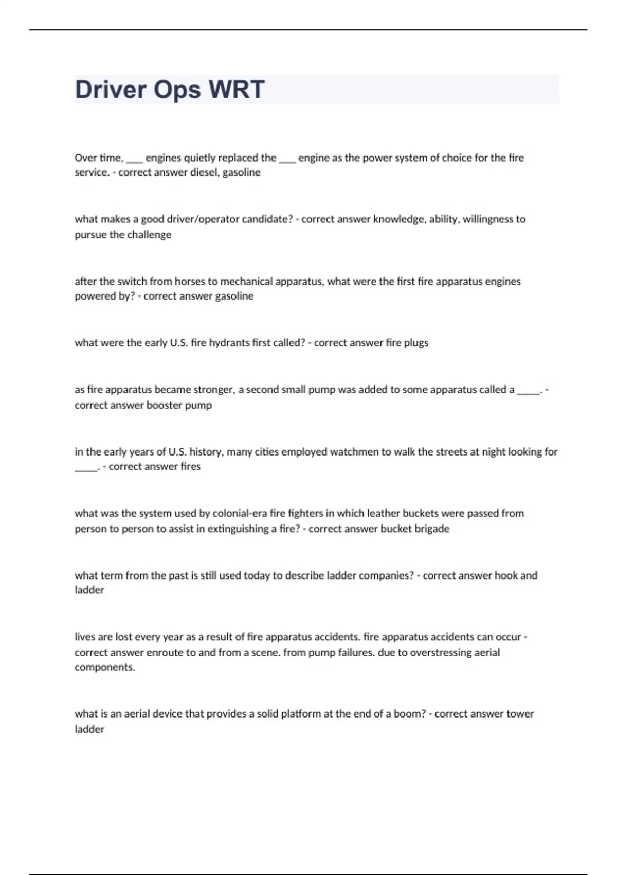 Driver Ops WRT Question and answers 2023/2024 verified to passOver time, ___ engines quietly replaced the ___ engine as the power system of choice for the fire service. - correct answer diesel, gasoline what makes a good driver/operator candidate? - correct answer knowledge, ability, willingness to pursue the challenge after the switch from horses to mechanical apparatus, what were the first fire apparatus engines powered by? - correct answer gasoline what were the early U.S. fire hydrants first called? - correct answer fire plugs