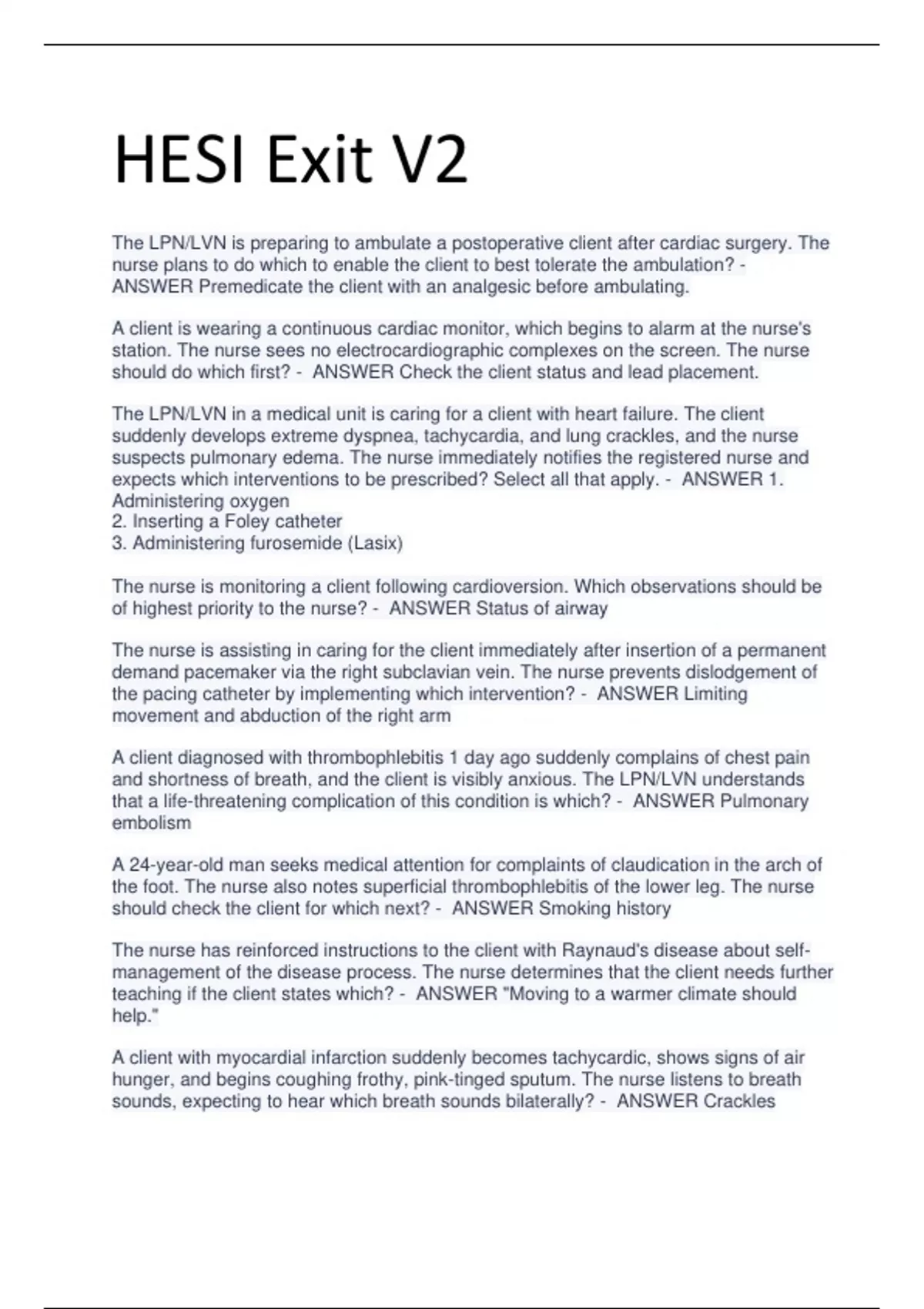 The LPN/LVN is preparing to ambulate a postoperative client after cardiac surgery. The nurse plans to do which to enable the client to best tolerate the ambulation? - ANSWER Premedicate the client with an analgesic before ambulating. A client is wearing a continuous cardiac monitor, which begins to alarm at the nurse's station. The nurse sees no electrocardiographic complexes on the screen. The nurse should do which first? - ANSWER Check the client status and lead placement. The LPN/LVN in a medical unit is caring for a client with heart failure. The client suddenly develops extreme dyspnea, tachycardia, and lung crackles, and the nurse suspects pulmonary edema. The nurse immediately notifies the registered nurse and expects which interventions to be prescribed? Select all that apply. - ANSWER 1. Administering oxygen 2. Inserting a Foley catheter 3. Administering furosemide (Lasix) The nurse is monitoring a client following cardioversion. Which observations should be of highest priority to the nurse? - ANSWER Status of airway The nurse is assisting in caring for the client immediately after insertion of a permanent demand pacemaker via the right subclavian vein. The nurse prevents dislodgement of the pacing catheter by implementing which intervention? - ANSWER Limiting movement and abduction of the right arm A client diagnosed with thrombophlebitis 1 day ago suddenly complains of chest pain and shortness of breath, and the client is visibly anxious. The LPN/LVN understands that a life-threatening complication of this condition is which? - ANSWER Pulmonary embolism A 24-year-old man seeks medical attention for complaints of claudication in the arch of the foot. The nurse also notes superficial thrombophlebitis of the lower leg. The nurse should check the client for which next? - ANSWER Smoking history The nurse has reinforced instructions to the client with Raynaud's disease about self- management of the disease process. The nurse determines that the client needs further teaching if the client states which? - ANSWER "Moving to a warmer climate should help." A client with myocardial infarction suddenly becomes tachycardic, shows signs of air hunger, and begins coughing frothy, pink-tinged sputum. The nurse listens to breath sounds, expecting to hear which breath sounds bilaterally? - ANSWER Crackles The LPN/LVN is collecting data on a client with a diagnosis of right- sided heart failure. The nurse should expect to note which specific characteristic of this condition? - ANSWER Dependent edema The LPN/LVN is checking the neurovascular status of a client who returned to the surgical nursing unit 4 hours ago after undergoing an aortoiliac bypass graft. The affected leg is warm, and the nurse notes redness and edema. The pedal pulse is palpable and unchanged from admission. The nurse interprets that the neurovascular status is which? - ANSWER Normal, caused by increased blood flow through the leg A client with a diagnosis of rapid rate atrial fibrillation asks the nurse why the health care provider is going to perform carotid massage. The LPN/LVN responds that this procedure may stimulate which? - ANSWER Vagus nerve to slow the heart rate A client is admitted to the hospital with possible rheumatic endocarditis. The LPN/LVN should check for a history of which type of infection? - ANSWER Staphylococcal infection client has an Unna boot applied for treatment of a venous stasis leg ulcer. The LPN/LVN notes that the client's toes are mottled, and cool and the client verbalizes some numbness and tingling of the foot. Which interpretation should the nurse make of these findings? - ANSWER The boot has been applied too tightly A client with angina complains that the anginal pain is prolonged and severe and occurs at the same time each day, most often in the morning. On further data collection, the nurse notes that the pain occurs in the absence of precipitating factors. How should the LPN/LVN best describe this type of anginal pain? - ANSWER Variant angina The LPN/LVN is monitoring a client with an abdominal aortic aneurysm (AAA). Which finding is probably unrelated to the AAA? - ANSWER Hyperactive bowel sounds in the area An emergency department client who complains of slightly improved but unrelieved chest pain for 2 days is reluctant to take a nitroglycerin sublingual tablet offered by the nurse. The client states, "I don't need that—my dad takes that for his heart. There's nothing wrong with my heart." Which description best describes the client's response? - ANSWER Denial A client is scheduled for a cardiac catheterization using a radiopaque dye. The LPN/LVN checks which most critical item before the procedure? - ANSWER Prior reaction to contrast media A client is scheduled for a dipyridamole thallium scan. The LPN/ LVN should check to make sure that the client has not consumed which substance before the procedure? - ANSWER Caffeine An ambulatory clinic nurse is interviewing a client who is complaining of flulike symptoms. The client suddenly develops chest pain. Which question best assists the nurse to discriminate pain caused by a non cardiac problem? - ANSWER "Does the pain get worse when you breathe in?" A client with myocardial infarction (MI) has been transferred from the coronary care unit (CCU) to the general medical unit with cardiac monitoring via telemetry. The nurse assisting in caring for the client expects to note which type of activity prescribed? - ANSWER Bathroom privileges and self-care activities The LPN/LVN is preparing to care for a client who will be arriving from the recovery room after an above-the-knee amputation. The nurse ensures that which priority item is available for emergency use? - ANSWER Surgical tourniquet A client is diagnosed with thrombophlebitis. The nurse should tell the client that which prescription is indicated? - ANSWER Bed rest, with elevation of the affected extremity A client returns to the nursing unit after an above knee amputation of the right l
