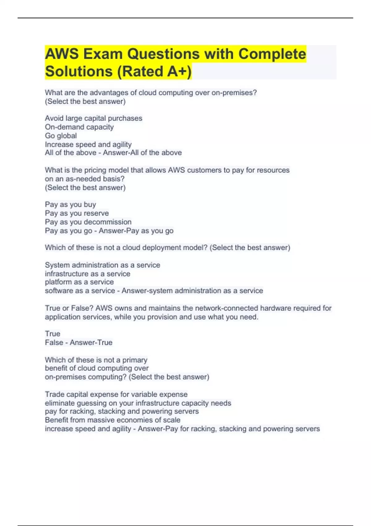 AWS Exam Questions with Complete Solutions (Rated A+) What are the advantages of cloud computing over on-premises? (Select the best answer) Avoid large capital purchases On-demand capacity Go global Increase speed and agility All of the above - Answer-All of the above What is the pricing model that allows AWS customers to pay for resources on an as-needed basis? (Select the best answer) Pay as you buy Pay as you reserve Pay as you decommission Pay as you go - Answer-Pay as you go Which of these is not a cloud deployment model? (Select the best answer) System administration as a service infrastructure as a service platform as a service software as a service - Answer-system administration as a service True or False? AWS owns and maintains the network-connected hardware required for application services, while you provision and use what you need. True False - Answer-True Which of these is not a primary benefit of cloud computing over on-premises computing? (Select the best answer) Trade capital expense for variable expense eliminate guessing on your infrastructure capacity needs pay for racking, stacking and powering servers Benefit from massive economies of scale increase speed and agility - Answer-Pay for racking, stacking and powering servers Which of the following are not benefits of AWS Cloud computing? (Choose two) High-availability High-latency Multiple procurement cycles Temporary and disposable resources Fault-tolerant databases - Answer-High-latency, Multiple procurement cycles What is the number one reason businesses are switching to cloud computing? Finite infrastructure Instant configuration Increased speed and agility Over-provisioning Automation - Answer-Increased speed and agility True or False? Cloud computing provides a simple way to access servers, storage, databases, and a broad set of application services over the Internet. You own the network connected hardware required for these services and Amazon Web Services provisions what you need. - Answer-False Economies of scale results from ______. (Select the best answer)
