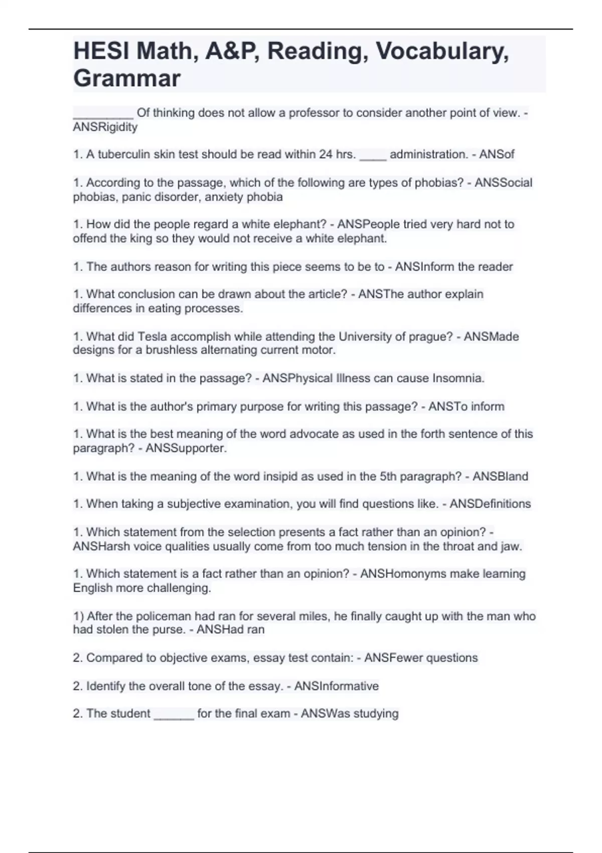 , HESI Math, A&P, Reading, Vocabulary,