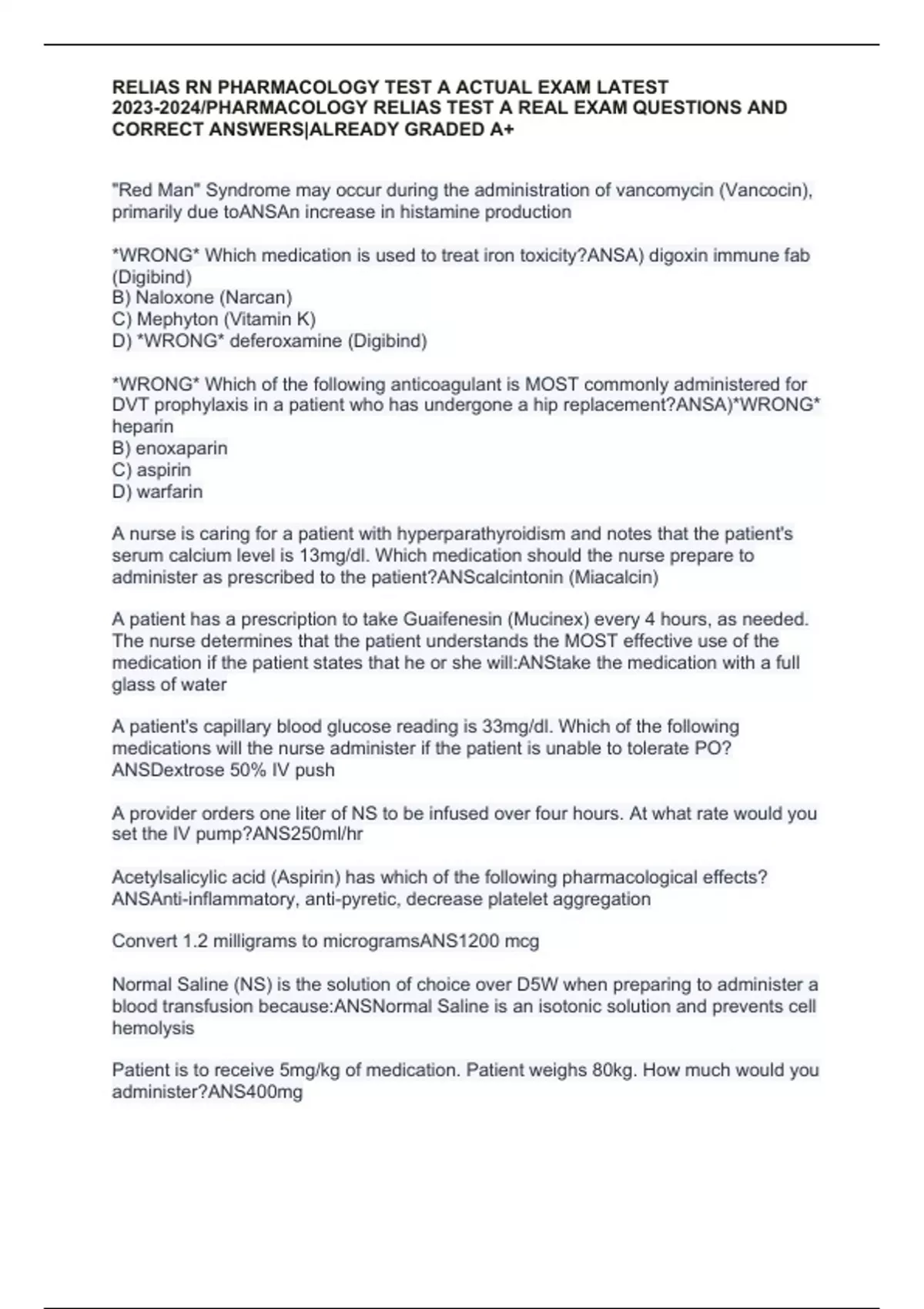 2023-2024/PHARMACOLOGY RELIAS TEST A REAL EXAM QUESTIONS AND