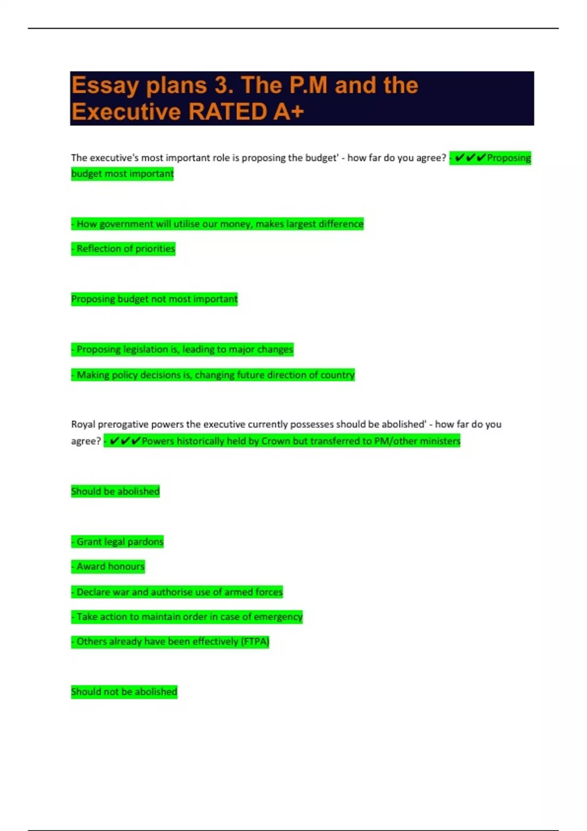 The executive's most important role is proposing the budget' - how far do you agree? - Proposing budget most important - How government will utilise our money, makes largest difference - Reflection of priorities Proposing budget not most important - Proposing legislation is, leading to major changes - Making policy decisions is, changing future direction of country Royal prerogative powers the executive currently possesses should be abolished' - how far do you agree? - Powers historically held by Crown but transferred to PM/other ministers Should be abolished - Grant legal pardons - Award honours - Declare war and authorise use of armed forces - Take action to maintain order in case of emergency - Others already have been effectively (FTPA) Should not be abolished - Grant legal pardons - Award honours - Declare war and authorise use of armed forces - Take action to maintain order in case of emergency - FTPA can be overridden Evaluate the view that the executive is too powerful in current UK politics - Executive too powerful - Parliamentary majority enables introduction of far-reaching, even irreversible legislation - use of secondary legislation and guillotine - patronage/whip powers + collective ministerial responsibility - royal prerogative powers - Control of parliamentary timetable - Parliamentary sovereignty, override with Acts of Parliament (Belmarsh case, Labour post 9/11) Executive not too powerful - Scrutiny work of SCs (see select committee essay) - Increasing restrictions on prerogative powers (see prerogative powers essay) - Increasing power of backbenchers (see backbenchers essay) - Held accountable by people at election time - Shift of power due to Brexit