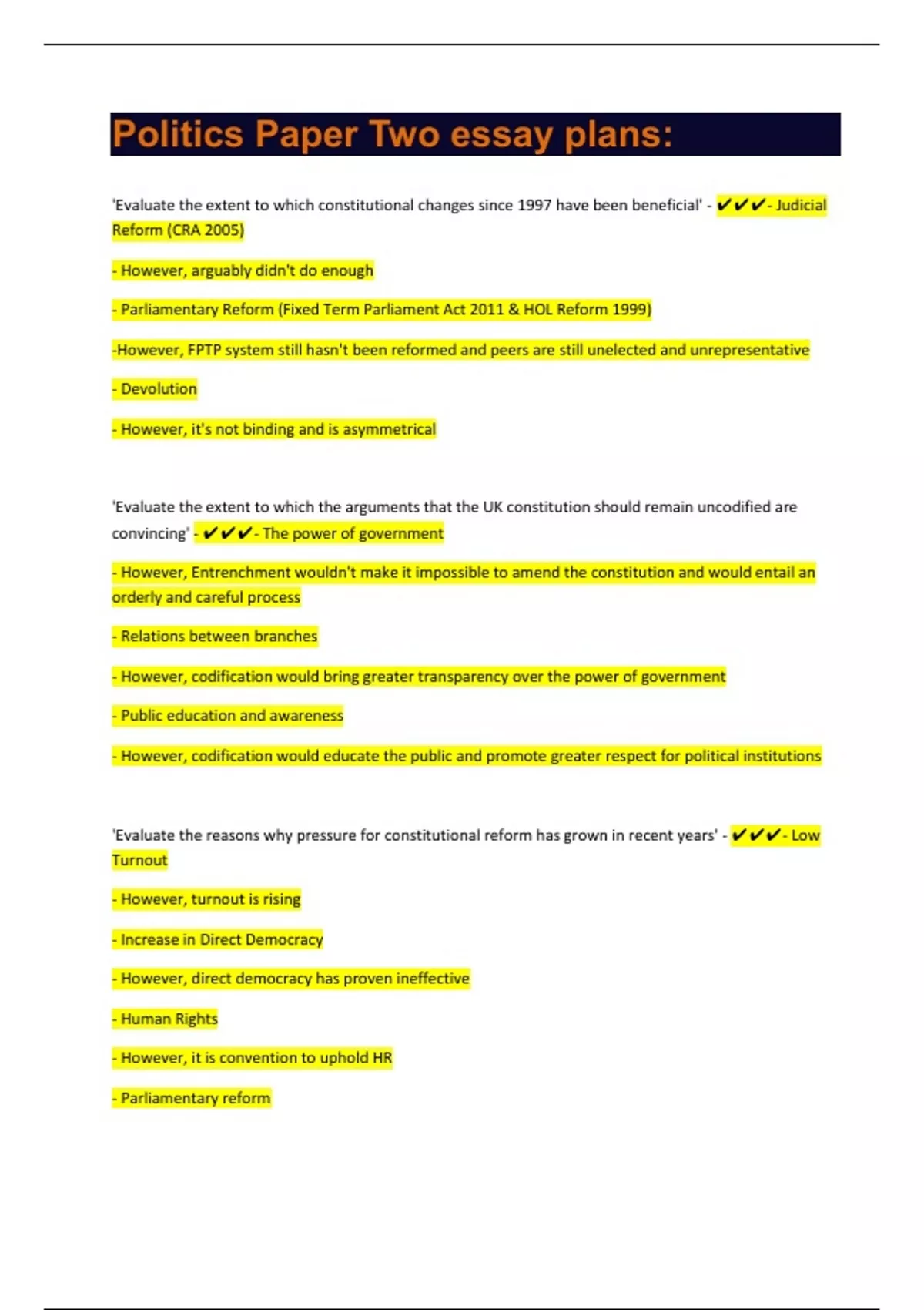 'Evaluate the extent to which constitutional changes since 1997 have been beneficial' - - Judicial Reform (CRA 2005) - However, arguably didn't do enough - Parliamentary Reform (Fixed Term Parliament Act 2011 & HOL Reform 1999) -However, FPTP system still hasn't been reformed and peers are still unelected and unrepresentative - Devolution - However, it's not binding and is asymmetrical 'Evaluate the extent to which the arguments that the UK constitution should remain uncodified are convincing' - - The power of government - However, Entrenchment wouldn't make it impossible to amend the constitution and would entail an orderly and careful process - Relations between branches - However, codification would bring greater transparency over the power of government - Public education and awareness - However, codification would educate the public and promote greater respect for political institutions 'Evaluate the reasons why pressure for constitutional reform has grown in recent years' - - Low Turnout - However, turnout is rising - Increase in Direct Democracy - However, direct democracy has proven ineffective - Human Rights - However, it is convention to uphold HR - Parliamentary reform
