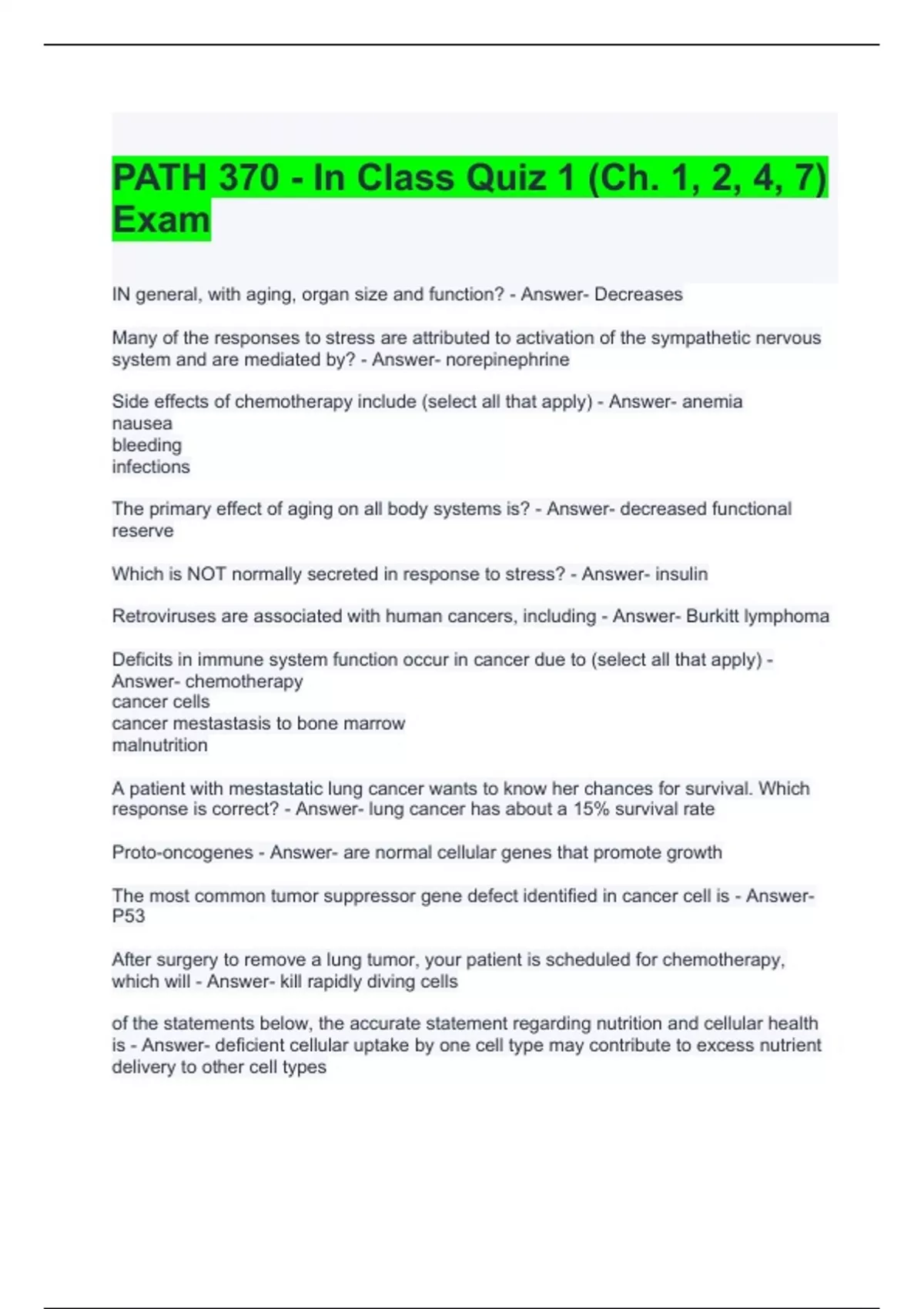 PATH 370 - In Class Quiz 1 (Ch. 1, 2, 4, 7) Exam Questions and Answers