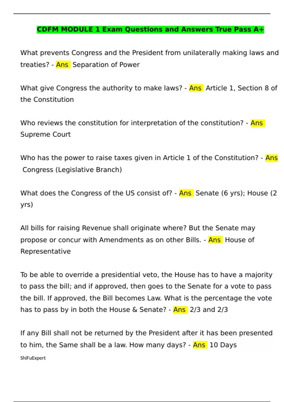 CDFM MODULE 1 Exam Questions and Answers True Pass A+ What prevents Congress and the President from unilaterally making laws and treaties? - Ans Separation of Power What give Congress the authority to make laws? - Ans Article 1, Section 8 of the Constitution Who reviews the constitution for interpretation of the constitution? - Ans Supreme Court Who has the power to raise taxes given in Article 1 of the Constitution? - Ans Congress (Legislative Branch) What does the Congress of the US consist of? - Ans Senate (6 yrs); House (2 yrs) All bills for raising Revenue shall originate where? But the Senate may propose or concur with Amendments as on other Bills. - Ans House of Representative To be able to override a presidential veto, the House has to have a majority to pass the bill; and if approved, then goes to the Senate for a vote to pass the bill. If approved, the Bill becomes Law. What is the percentage the vote has to pass by in both the House & Senate? - Ans 2/3 and 2/3 If any Bill shall not be returned by the President after it has been presented to him, the Same shall be a law. How many days? - Ans 10 Days Who has the power to lay and collect taxes, duties, imposts and Excises to pay the debts and provide for the common defense and general welfare of the United States. - Ans Congress Article 1, Section 8 of the Constitution allows for what? - Ans 1) borrow money on credit 2) regulate commerce; 3) Coin money; 4) Constitute Tribunals; 5) Declare War; 6) Raise and support Armies; 7) provide and maintain Navy; 8) Make Rules for Government Regulation of land and naval forces; 9) Provide for calling forth Militia; 10) to make all laws