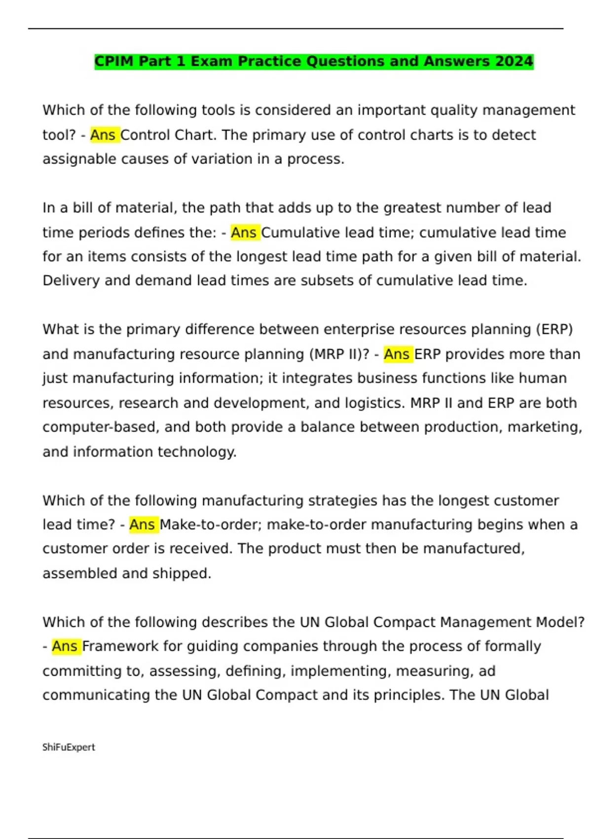 CPIM Part 1 Exam Practice Questions and Answers 2024 Which of the following tools is considered an important quality management tool? - Ans Control Chart. The primary use of control charts is to detect assignable causes of variation in a process. In a bill of material, the path that adds up to the greatest number of lead time periods defines the: - Ans Cumulative lead time; cumulative lead time for an items consists of the longest lead time path for a given bill of material. Delivery and demand lead times are subsets of cumulative lead time. What is the primary difference between enterprise resources planning (ERP) and manufacturing resource planning (MRP II)? - Ans ERP provides more than just manufacturing information; it integrates business functions like human resources, research and development, and logistics. MRP II and ERP are both computer-based, and both provide a balance between production, marketing, and information technology. Which of the following manufacturing strategies has the longest customer lead time? - Ans Make-to-order; make-to-order manufacturing begins when a customer order is received. The product must then be manufactured, assembled and shipped. Which of the following describes the UN Global Compact Management Model? - Ans Framework for guiding companies through the process of formally committing to, assessing, defining, implementing, measuring, ad communicating the UN Global Compact and its principles. The UN Global Compact Management Model is a practical yet comprehensive tool to help companies evolve their sustainability efforts. Which of the following is true of preparing a forecast based on historical data? - Ans The data needs to be in the same terms as needed for the forecasts. It is important that historical data match what is being forecasted. If the purpose is to forecast demand on production, data based on demand - not, for example, shipments - is needed. Which of these terms refers to activities that provide present benefit without compromising the needs of future generations? - Ans Sustainability; sustainability refers to activities that provide present benefit without compromising the needs of future generations. Given the following, what is the work center backlog? Avg Input: 100 units/week. Avg Output: 100 units/week. Current work in progress: 160 units - Ans 1.6 weeks; To calculate the load that is backlog at a work center, divide the current number of units (or hours) currently at the work center by the average output, or 160 units/100 units of output per week = 1.6 weeks of load