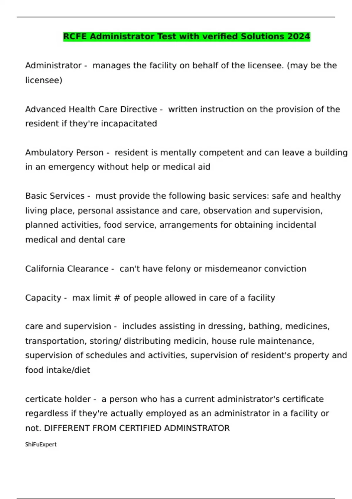 RCFE Administrator Test with verified Solutions 2024 Administrator - manages the facility on behalf of the licensee. (may be the licensee) Advanced Health Care Directive - written instruction on the provision of the resident if they're incapacitated Ambulatory Person - resident is mentally competent and can leave a building in an emergency without help or medical aid Basic Services - must provide the following basic services: safe and healthy living place, personal assistance and care, observation and supervision, planned activities, food service, arrangements for obtaining incidental medical and dental care California Clearance - can't have felony or misdemeanor conviction Capacity - max limit # of people allowed in care of a facility care and supervision - includes assisting in dressing, bathing, medicines, transportation, storing/ distributing medicin, house rule maintenance, supervision of schedules and activities, supervision of resident's property and food intake/diet certicate holder - a person who has a current administrator's certificate regardless if they're actually employed as an administrator in a facility or not. DIFFERENT FROM CERTIFIED ADMINSTRATOR certified administrator - administrator who has a current RCFE Certificate and is employed in a facility as an administrator Close Friend - attached to another by feeling of personal regard as indicated by both parties involved