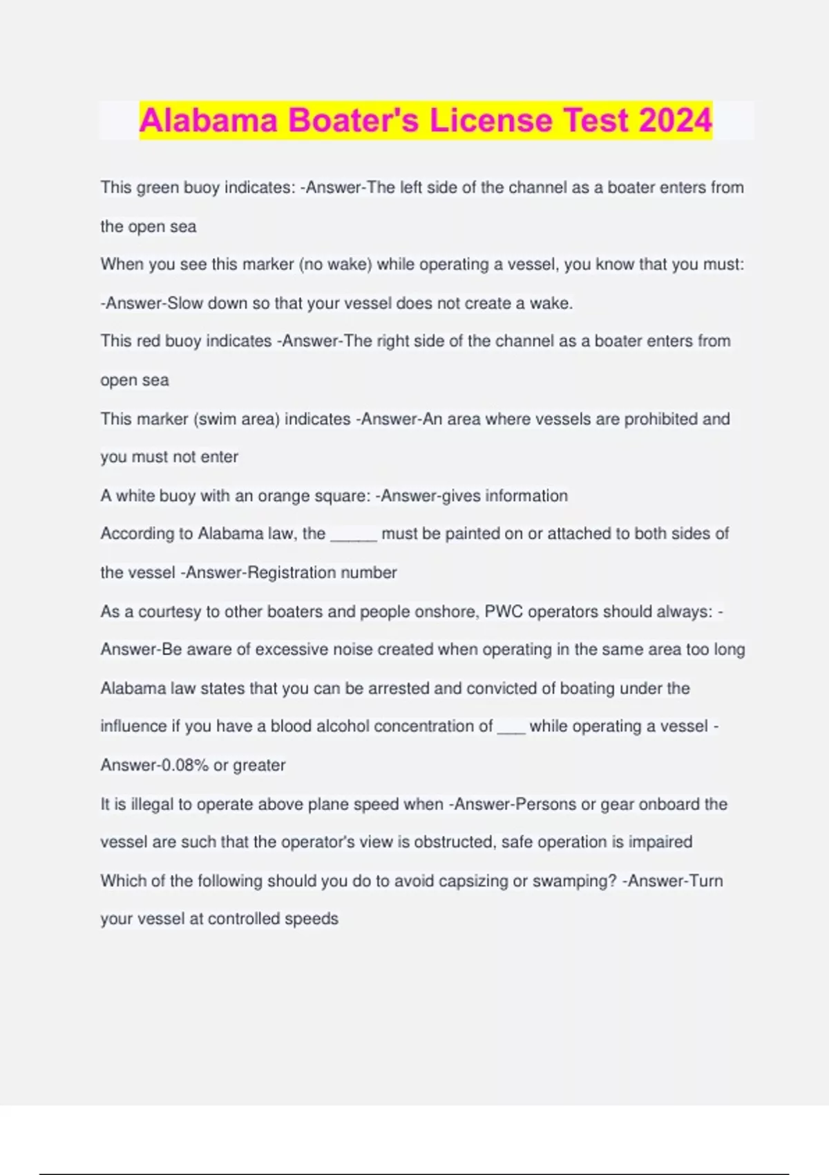 Alabama Boater's License Test 2024 This green buoy indicates: -Answer-The left side of the channel as a boater enters from the open sea When you see this marker (no wake) while operating a vessel, you know that you must: -Answer-Slow down so that your vessel does not create a wake. This red buoy indicates -Answer-The right side of the channel as a boater enters from open sea This marker (swim area) indicates -Answer-An area where vessels are prohibited and you must not enter A white buoy with an orange square: -Answer-gives information According to Alabama law, the _____ must be painted on or attached to both sides of the vessel -Answer-Registration number As a courtesy to other boaters and people onshore, PWC operators should always: - Answer-Be aware of excessive noise created when operating in the same area too long Alabama law states that you can be arrested and convicted of boating under the influence if you have a blood alcohol concentration of ___ while operating a vessel - Answer-0.08% or greater It is illegal to operate above plane speed when -Answer-Persons or gear onboard the vessel are such that the operator's view is obstructed, safe operation is impaired Which of the following should you do to avoid capsizing or swamping? -Answer-Turn your vessel at controlled speeds If operating a powerboat, you are always the give-way boat when encountering ____, unless being overtaken by that vessel -Answer-a sailboat Alabama law states that a person must be at least ___ of age to be eligible for boater safety certification and be legally able to operate any motorized vessel (including PWC) -Answer-12 years It is illegal to attach your vessel to: -Answer-a U.S. Aids to Navigation System buoy or regulatory marker It is illegal to operate a vessel at a speed which ___ when approaching another vessel or when entering or leaving a marina or harbor area -Answer-Causes a hazardous wake or wash At a minimum, before embarking on a daytime outing on the water, you should: - Answer-Contact a responsible person before going out and tell him or her where you will be boating and when you plan to return If you are operating a PWC and see a powerboat approaching from the right, what should you do? -Answer-You are the vessel on the left and so you should give way and allow the other vessel to pass Which of the following should you do as part of your responsibility to the environment while boating? -Answer-Reduce throttle to no wake speed when close to a shoreline or in small rivers to help prevent erosion Which is true regarding navigation sidelights? -Answer-A green navigation sidelight is on the starboard (right) side of the vessel Which of the following is not one of the 3 major navigation responsibilities of an operator? -Answer-Maintain the same speed as the majo