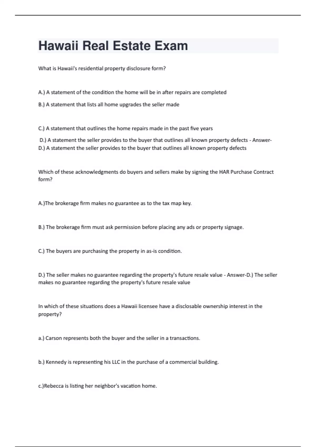 What is Hawaii's residential property disclosure form? A.) A statement of the condition the home will be in after repairs are completed B.) A statement that lists all home upgrades the seller made C.) A statement that outlines the home repairs made in the past five years D.) A statement the seller provides to the buyer that outlines all known property defects - AnswerD.) A statement the seller provides to the buyer that outlines all known property defects Which of these acknowledgments do buyers and sellers make by signing the HAR Purchase Contract form? A.)The brokerage firm makes no guarantee as to the tax map key. B.) The brokerage firm must ask permission before placing any ads or property signage. C.) The buyers are purchasing the property in as-is condition. D.) The seller makes no guarantee regarding the property's future resale value - Answer-D.) The seller makes no guarantee regarding the property's future resale value In which of these situations does a Hawaii licensee have a disclosable ownership interest in the property? a.) Carson represents both the buyer and the seller in a transactions. b.) Kennedy is representing his LLC in the purchase of a commercial building. c.)Rebecca is listing her neighbor's vacation home.d.) Roger is listing a property that he sold to the current owner eight years ago. - Answer-b.) Kennedy is representing his LLC in the purchase of a commercial building. **Jeanine sold her Kihei duplex to Carlton for $418,000, and closing is on May 16. Each unit rents for $530 per month. The tenants paid rent in full on May 1. At closing, how will prorated rent be shown on the closing statements? a.)$494.66 seller credit, buyer debit b.)494.66 seller debit, buyer credit c.)$565.33 seller credit, buyer debit d.)$565.33 seller debit, buyer credit - Answer-b.)494.66 seller debit, buyer credit