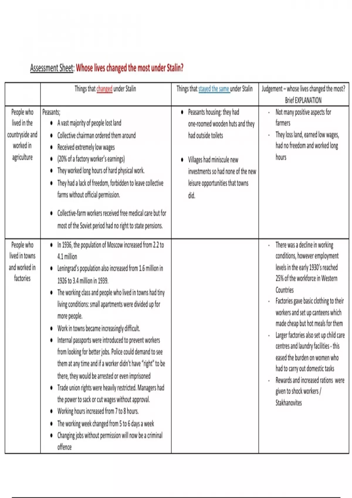 Things that changed under Stalin Things that stayed the same under Stalin Judgement – whose lives changed the most?