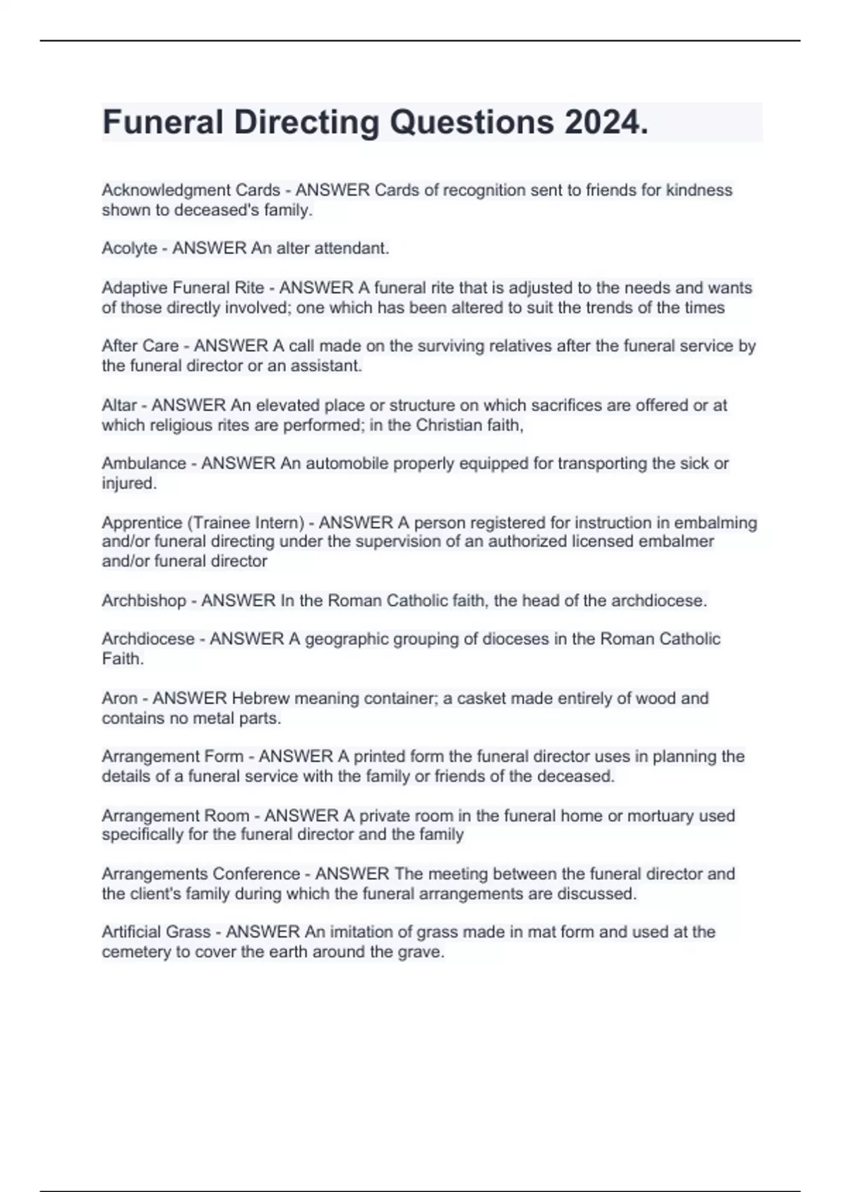 Funeral Directing Questions 2024.Acknowledgment Cards - ANSWER Cards of recognition sent to friends for kindness shown to deceased's family. Acolyte - ANSWER An alter attendant. Adaptive Funeral Rite - ANSWER A funeral rite that is adjusted to the needs and wants of those directly involved; one which has been altered to suit the trends of the times After Care - ANSWER A call made on the surviving relatives after the funeral service by the funeral director or an assistant. Altar - ANSWER An elevated place or structure on which sacrifices are offered or at which religious rites are performed; in the Christian faith, Ambulance - ANSWER An automobile properly equipped for transporting the sick or injured. Apprentice (Trainee Intern) - ANSWER A person registered for instruction in embalming and/or funeral directing under the supervision of an authorized licensed embalmer and/or funeral director Archbishop - ANSWER In the Roman Catholic faith, the head of the archdiocese. Archdiocese - ANSWER A geographic grouping of dioceses in the Roman Catholic Faith. Aron - ANSWER Hebrew meaning container; a casket made entirely of wood and contains no metal parts. Arrangement Form - ANSWER A printed form the funeral director uses in planning the details of a funeral service with the family or friends of the deceased. Arrangement Room - ANSWER A private room in the funeral home or mortuary used specifically for the funeral director and the family Arrangements Conference - ANSWER The meeting between the funeral director and the client's family during which the funeral arrangements are discussed. Artificial Grass - ANSWER An imitation of grass made in mat form and used at the cemetery to cover the earth around the grave.