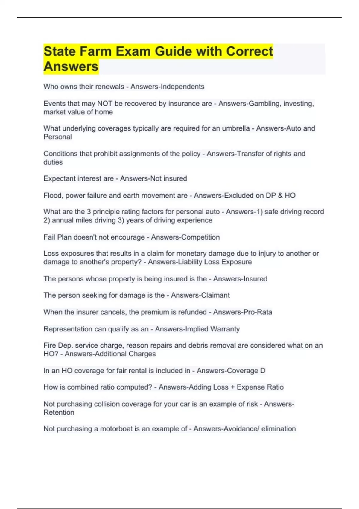 Who owns their renewals - Answers-Independents Events that may NOT be recovered by insurance are - Answers-Gambling, investing, market value of home What underlying coverages typically are required for an umbrella - Answers-Auto and Personal Conditions that prohibit assignments of the policy - Answers-Transfer of rights and duties Expectant interest are - Answers-Not insured Flood, power failure and earth movement are - Answers-Excluded on DP & HO What are the 3 principle rating factors for personal auto - Answers-1) safe driving record 2) annual miles driving 3) years of driving experience Fail Plan doesn't not encourage - Answers-Competition Loss exposures that results in a claim for monetary damage due to injury to another or damage to another's property? - Answers-Liability Loss Exposure The persons whose property is being insured is the - Answers-Insured The person seeking for damage is the - Answers-Claimant When the insurer cancels, the premium is refunded - Answers-Pro-Rata Representation can qualify as an - Answers-Implied Warranty Fire Dep. service charge, reason repairs and debris removal are considered what on an HO? - Answers-Additional Charges In an HO coverage for fair rental is included in - Answers-Coverage D How is combined ratio computed? - Answers-Adding Loss + Expense Ratio Not purchasing collision coverage for your car is an example of risk - Answers-Retention Not purchasing a motorboat is an example of - Answers-Avoidance/ elimination