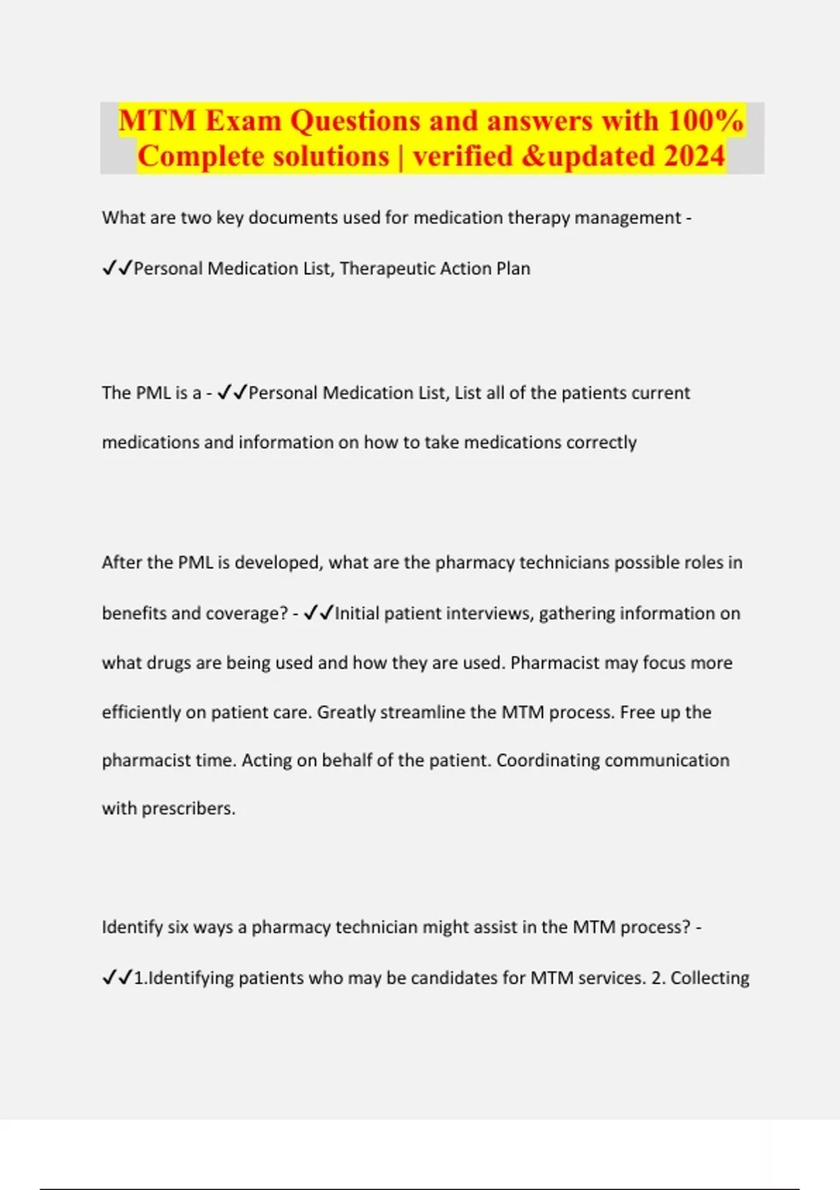 MTM Exam Questions and answers with 100% Complete solutions | verified &updated 2024 What are two key documents used for medication therapy management - Personal Medication List, Therapeutic Action Plan The PML is a - Personal Medication List, List all of the patients current medications and information on how to take medications correctly After the PML is developed, what are the pharmacy technicians possible roles in benefits and coverage? - Initial patient interviews, gathering information on what drugs are being used and how they are used. Pharmacist may focus more efficiently on patient care. Greatly streamline the MTM process. Free up the pharmacist time. Acting on behalf of the patient. Coordinating communication with prescribers.