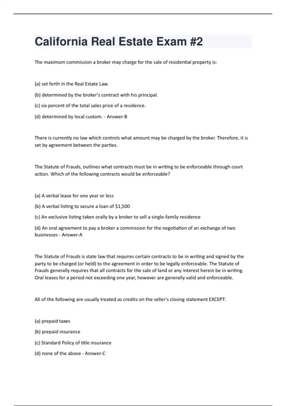The maximum commission a broker may charge for the sale of residential property is: (a) set forth in the Real Estate Law. (b) determined by the broker's contract with his principal. (c) six percent of the total sales price of a residence. (d) determined by local custom. - Answer-B There is currently no law which controls what amount may be charged by the broker. Therefore, it is set by agreement between the parties. The Statute of Frauds, outlines what contracts must be in writing to be enforceable through court action. Which of the following contracts would be enforceable? (a) A verbal lease for one year or less (b) A verbal listing to secure a loan of $1,500 (c) An exclusive listing taken orally by a broker to sell a single-family residence (d) An oral agreement to pay a broker a commission for the negotiation of an exchange of two businesses - Answer-A The Statute of Frauds is state law that requires certain contracts to be in writing and signed by the party to be charged (or held) to the agreement in order to be legally enforceable. The Statute of Frauds generally requires that all contracts for the sale of land or any interest herein be in writing. Oral leases for a period not exceeding one year, however are generally valid and enforceable. All of the following are usually treated as credits on the seller's closing statement EXCEPT: (a) prepaid taxes (b) prepaid insurance (c) Standard Policy of title insurance (d) none of the above - Answer-CIt is important to understand that this can change based on geographic region and custom. Who pays for title insurance is ultimately a negotiable item. A disadvantage for the buyer under a Land Contract is: (a) If the seller dies during the contract term, litigation may be necessary to obtain clear title. (b) Financial institutions consider land contracts unsatisfactory collateral. (c) Transfer of vendee's interest may be restricted by covenants. (d) All of the above - Answer-D The disadvantages of a Land Contract to the buyer are several, chiefly: Covenants or restrictions of assignment or transfer of the land contract may hamper or prevent the transfer of buyer's interest therein. The buyer may not be aware of these problems until the time to transfer title. A prevailing opinion among financial institutions that a Land Contract is poor collateral because it is subject to a more rapid termination in the event of default. After full performance, the buyer may receive defective title or no title at all, although normally the contract will require delivery of a policy of title insurance. The buyer may have to pay the premium for this. Lack of assurance that the seller has good title at the time the contract is made, coupled with the fact that prior to full performance by the buyer, the buyer may not rescind the contract on these grounds. If during the contract term the seller should go bankrupt or die and title passes to heirs or be declared incompetent or have a conservator appointed, the buyer can at the very least anticipate time consuming, frustrating, and expensive litigation before obtaining a deed and policy of title insurance. How would an appraiser define the boundaries of a residential neighborhood? (a) by social conformity(b) geographically (c) by traffic patterns (d) by economic status - Answer-A