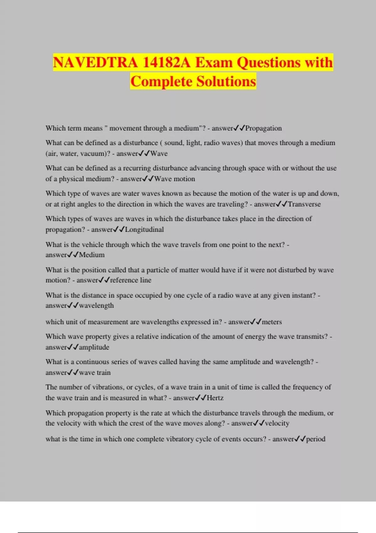 NAVEDTRA 14182A Exam Questions with Complete Solutions Which term means " movement through a medium"? - answerPropagation What can be defined as a disturbance ( sound, light, radio waves) that moves through a medium (air, water, vacuum)? - answerWave What can be defined as a recurring disturbance advancing through space with or without the use of a physical medium? - answerWave motion Which type of waves are water waves known as because the motion of the water is up and down, or at right angles to the direction in which the waves are traveling? - answerTransverse Which types of waves are waves in which the disturbance takes place in the direction of propagation? - answerLongitudinal What is the vehicle through which the wave travels from one point to the next? - answerMedium What is the position called that a particle of matter would have if it were not disturbed by wave motion? - answerreference line What is the distance in space occupied by one cycle of a radio wave at any given instant? - answerwavelength which unit of measurement are wavelengths expressed in? - answermeters Which wave property gives a relative indication of the amount of energy the wave transmits? - answeramplitude What is a continuous series of waves called having the same amplitude and wavelength? - answerwave train The number of vibrations, or cycles, of a wave train in a unit of time is called the frequency of the wave train and is measured in what? - answerHertz Which propagation property is the rate at which the disturbance travels through the medium, or the velocity with which the crest of the wave moves along? - answervelocity what is the time in which one complete vibratory cycle of events occurs? - answerperiod what is a wave called that is directed toward the surface of the mirror? - answerincident What is the angle between the reflected wave and the normal called? - answerAngle of reflection In empty rooms or other confined spaces, sound may be reflected several times to cause what is known as? - answerreverberation What is any disturbance, man0made or natural, that causes an undesirable response or the degradation of a wave referred to as? - answerinterference What is the most complex sound wave that can be produced? - answernoise What is light a form of? - answerelectromagnetic radiation Current light theory says that light is made up of very small packets of electromagnetic energy called what? - answerPhotons Approximately how many miles per second does light travel? - answer186,000 What is a large volume of light called? - answerBeam What is a narrow volume of light called? - answerpenci