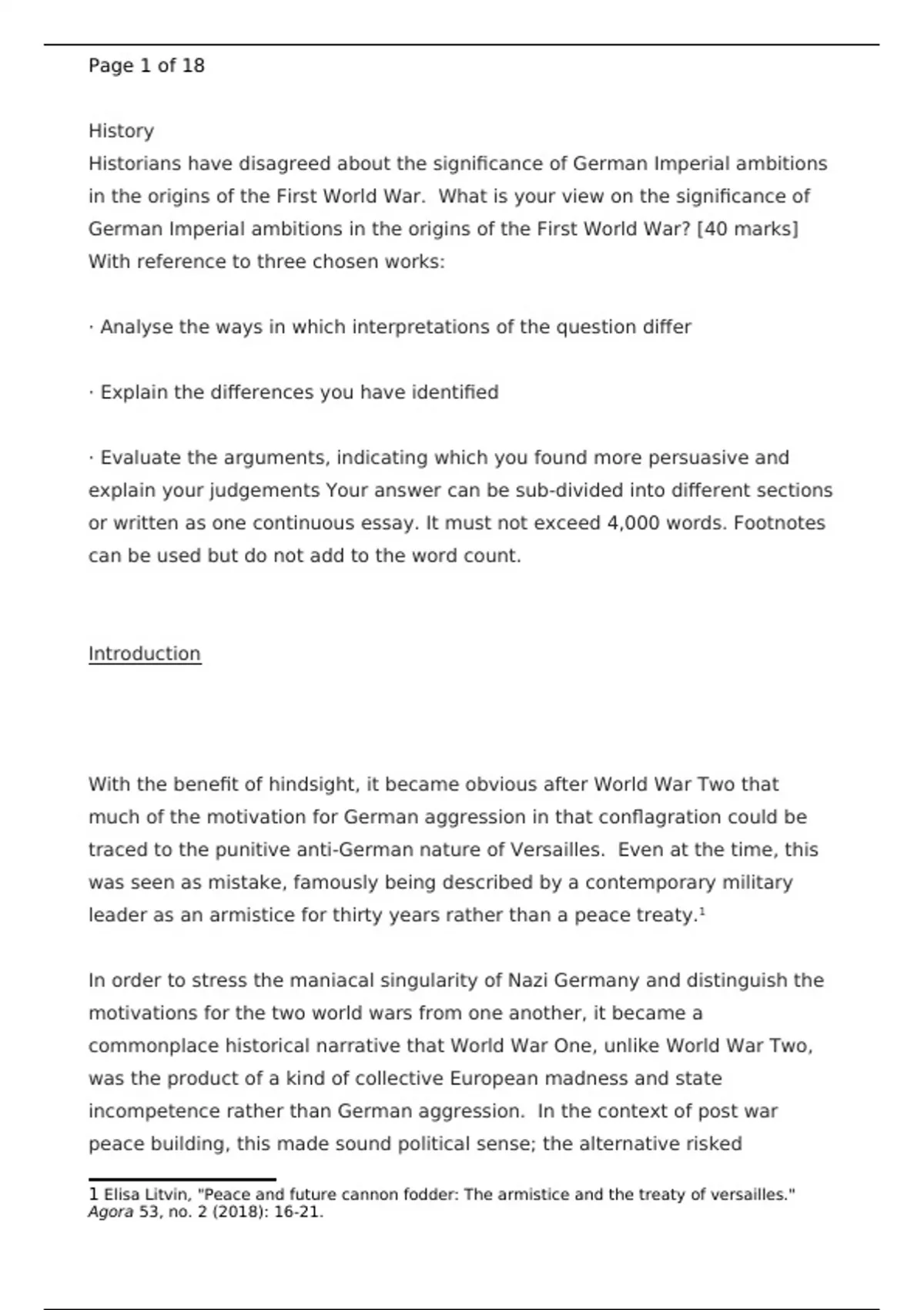 Historians have disagreed about the significance of German Imperial ambitions in the origins of the First World War. What is your view on the significance of German Imperial ambitions in the origins of the First World War? [40 marks] With reference to three chosen works: · Analyse the ways in which interpretations of the question differ · Explain the differences you have identified · Evaluate the arguments, indicating which you found more persuasive and explain your judgements Your answer can be sub-divided into different sections or written as one continuous essay. It must not exceed 4,000 words. Footnotes can be used but do not add to the word count.