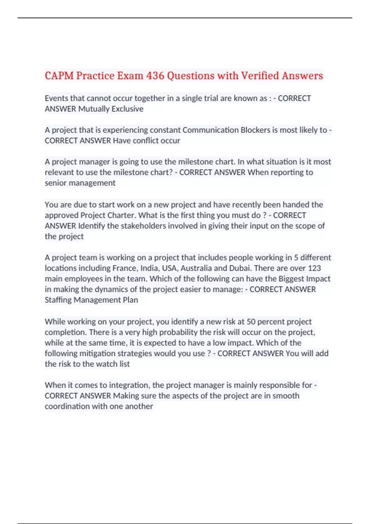 CAPM Practice Exam 436 Questions with Verified Answers,100% CORRECT