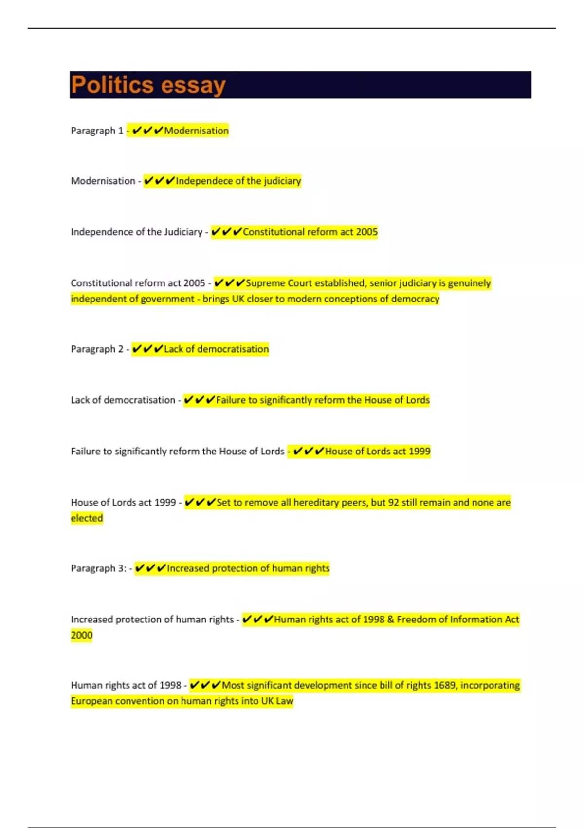 Paragraph 1 - Modernisation Modernisation - Independece of the judiciary Independence of the Judiciary - Constitutional reform act 2005 Constitutional reform act 2005 - Supreme Court established, senior judiciary is genuinely independent of government - brings UK closer to modern conceptions of democracy Paragraph 2 - Lack of democratisation Lack of democratisation - Failure to significantly reform the House of Lords Failure to significantly reform the House of Lords - House of Lords act 1999 House of Lords act 1999 - Set to remove all hereditary peers, but 92 still remain and none are elected Paragraph 3: - Increased protection of human rights Increased protection of human rights - Human rights act of 1998 & Freedom of Information Act 2000 Human rights act of 1998 - Most significant development since bill of rights 1689, incorporating European convention on human rights into UK Law