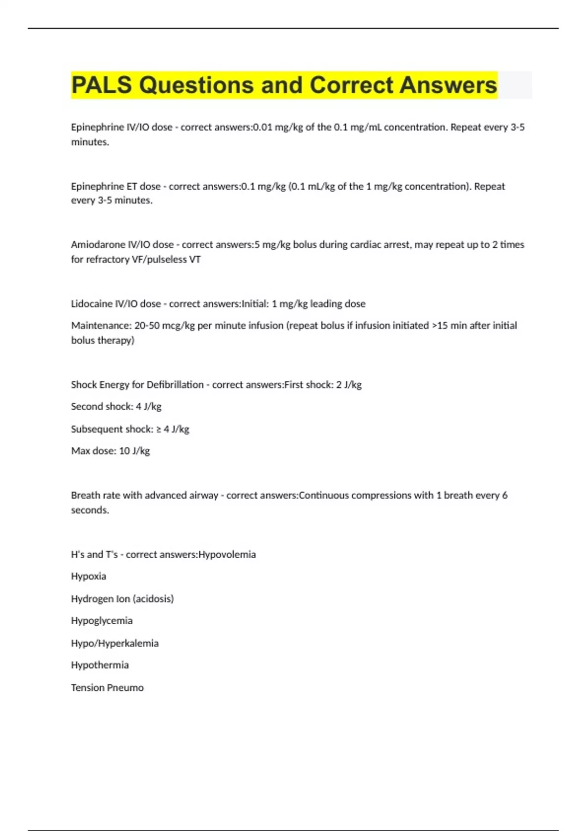 PALS Questions and Correct Answers
