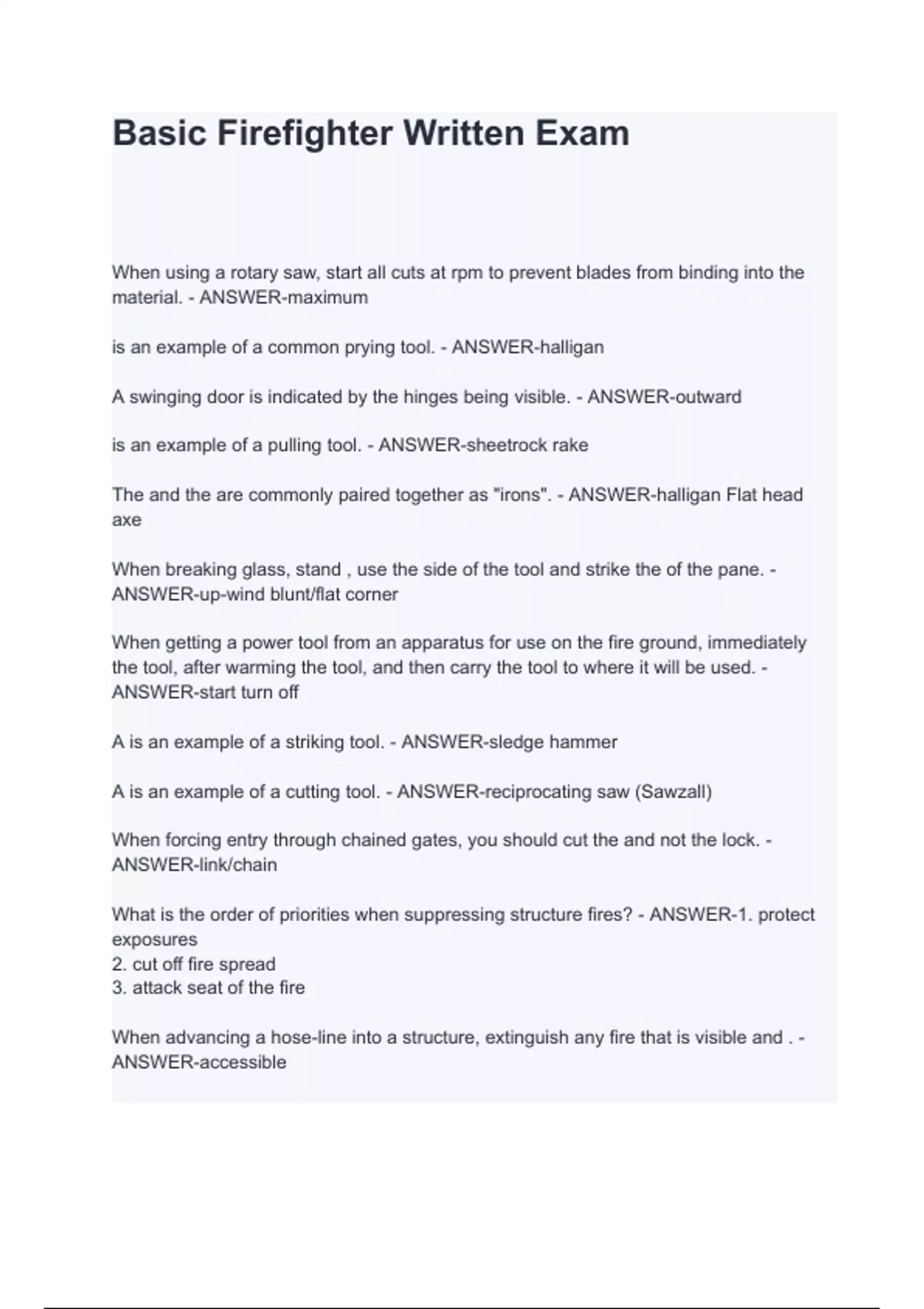Basic Firefighter Written Exam questions and answers
