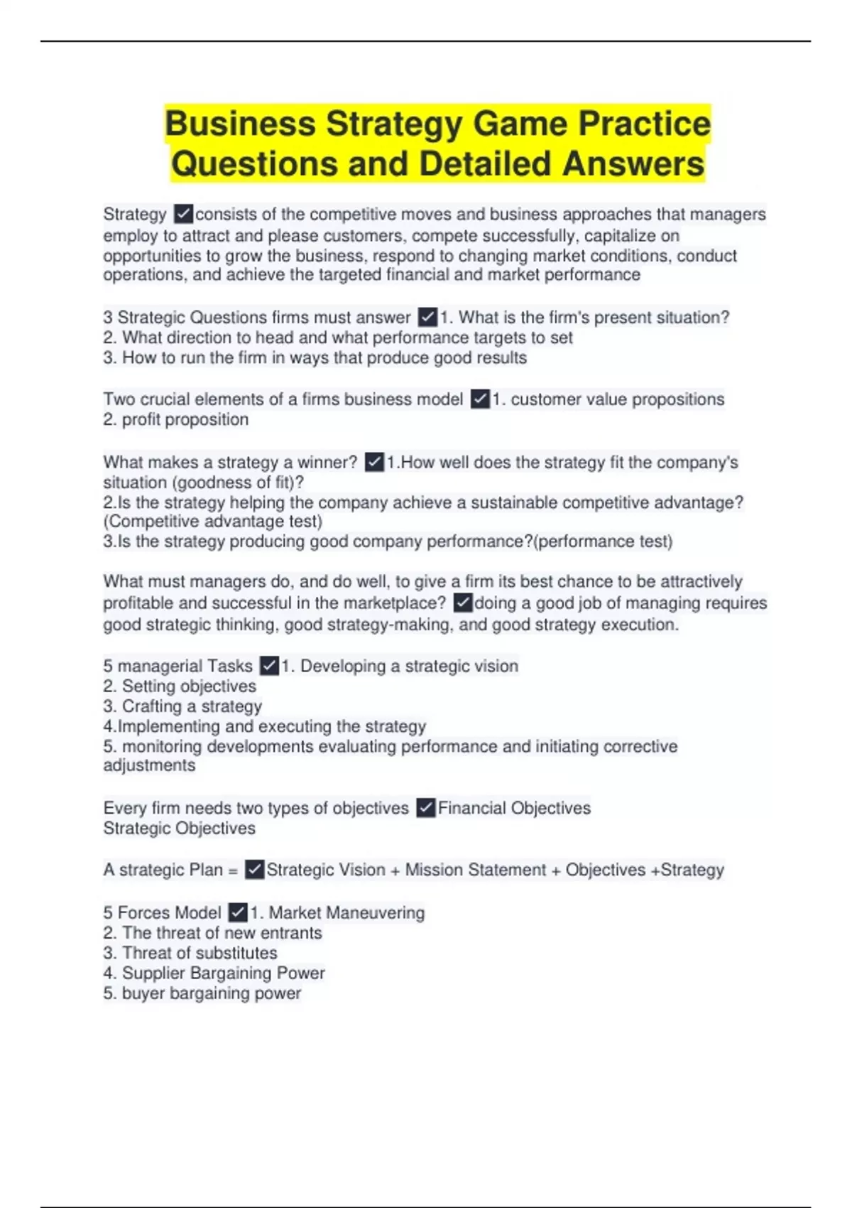 Strategy consists of the competitive moves and business approaches that managers employ to attract and please customers, compete successfully, capitalize on opportunities to grow the business, respond to changing market conditions, conduct operations, and achieve the targeted financial and market performance 3 Strategic Questions firms must answer 1. What is the firm's present situation? 2. What direction to head and what performance targets to set 3. How to run the firm in ways that produce good results Two crucial elements of a firms business model 1. customer value propositions 2. profit proposition What makes a strategy a winner? 1.How well does the strategy fit the company's situation (goodness of fit)? 2.Is the strategy helping the company achieve a sustainable competitive advantage? (Competitive advantage test) 3.Is the strategy producing good company performance?(performance test) What must managers do, and do well, to give a firm its best chance to be attractively profitable and successful in the marketplace? doing a good job of managing requires good strategic thinking, good strategy-making, and good strategy execution